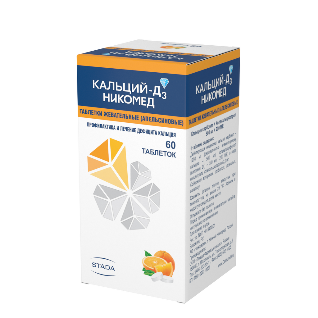 Активные вещества: кальция карбонат 1250 мг, эквивалентно элементарному кальцию 500 мг; колекальциферол (вит. D3) 5 мкг* (200 МЕ) в виде концентрата** колекальциферола 2 мг*.