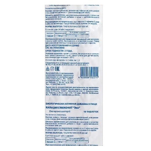 Препарат Кальция Глюконат «Эко» предназначен для восполнения недостатка микроэлемента кальция.