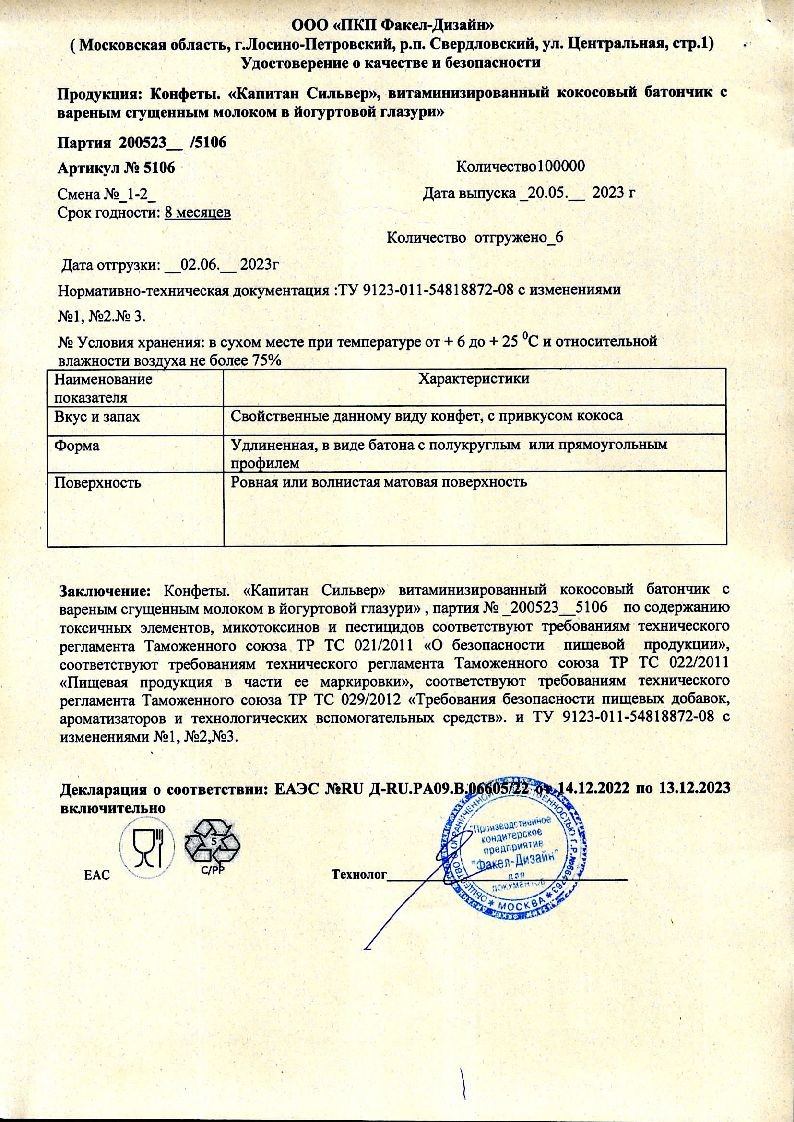 Глазурь кондитерская «Йогуртовая» (сахар, заменитель какао масла, сыворотка сухая молочная деминерализованная, молоко сухое обезжиренное, эмульгаторы: лецитин соевый, Е476, комплексная пищевая добавка «Йогуртовый порошок» (мальтодекстрин (загуститель), порошок йогурта, регуляторы кислотности (молочная кислота, лактат кальция), ароматизатор натуральный йогурт), сахар, патока крахмальная, кокосовая стружка, сыворотка молочная сухая, молоко сгущенное вареное, мальтодекстрин (загуститель), жир растительный (масла растительные, эмульгаторы (моно- и диглицериды жирных кислот, лецитин), витаминно-минеральная смесь (кальций углекислый, аскорбиновая кислота, премикс витаминно-минеральный (тиамина мононитрат, рибофлавин, пиридоксина гидрохлорид, никотинамид, фолиевая кислота, железо электролитическое), ароматизатор натуральный «Кокос».