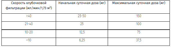 При нарушении функции почек легкой и умеренной степени тяжести (СКФ более 40 мл/мин/1,73 м2) каптоприл можно назначать в дозе 75-150 мг/сутки (коррекция дозы не требуется).