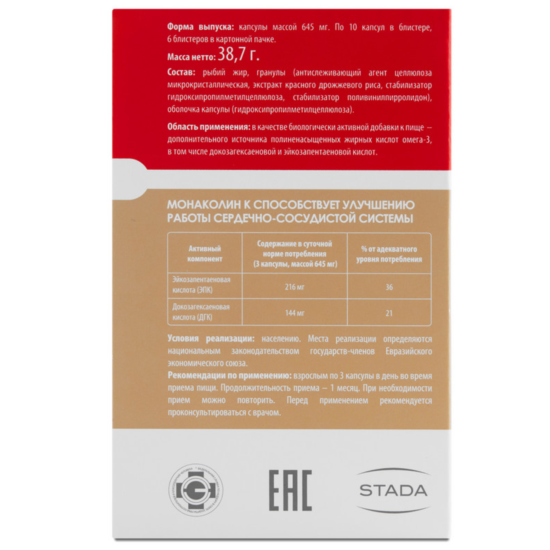 Рыбий жир, гранулы (антислеживающий агент целлюлоза микрокристаллическая, экстракт красного дрожжевого риса, стабилизатор гидроксипропилметилцеллюлоза, стабилизатор поливинилпирролидон), оболочка капсулы (гидроксипропилметилцеллюлоза).