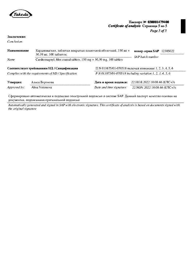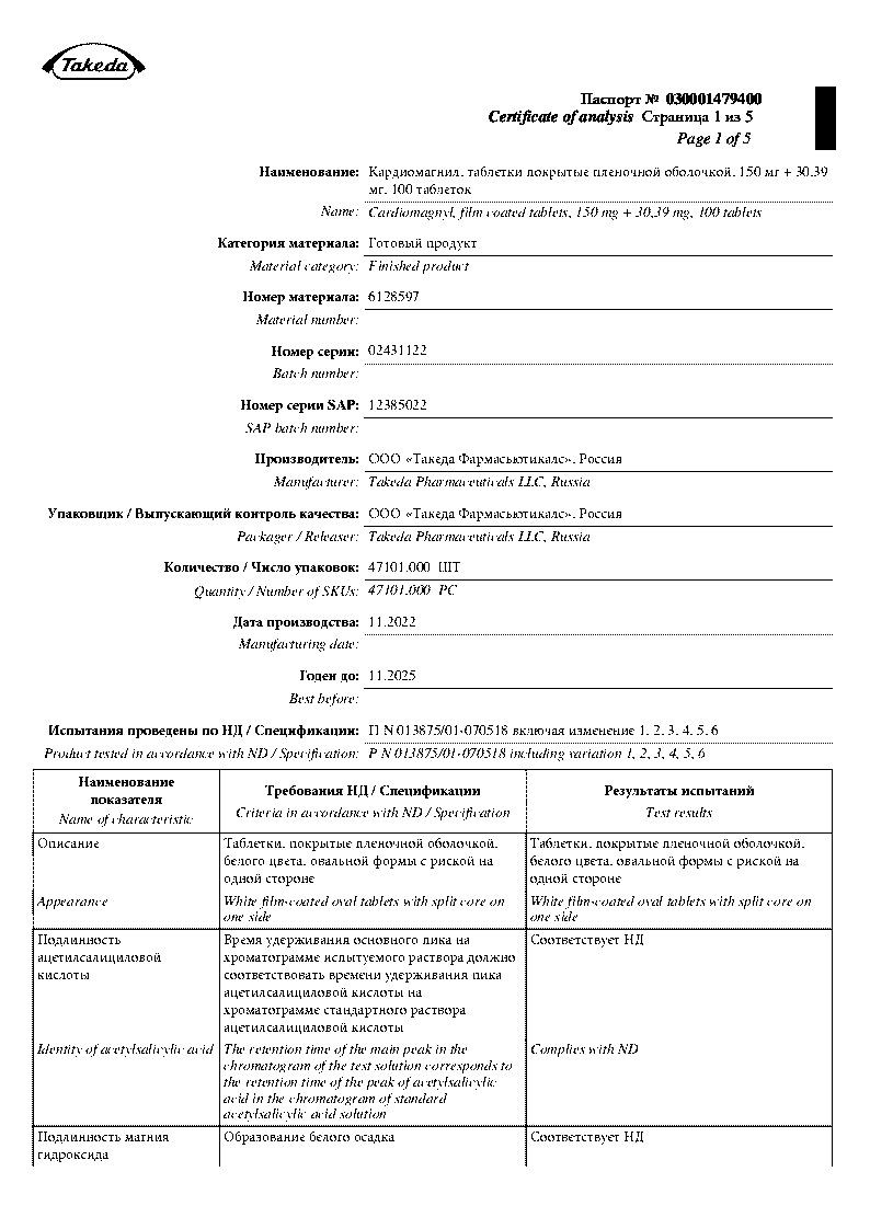 Для первичной профилактики сердечно-сосудистых заболеваний, таких как тромбоз и острая сердечная недостаточность при наличии факторов риска (например, сахарный диабет, гиперлипидемия, артериальная гипертензия, ожирение, курение, пожилой возраст) назначают по 1 таб. Кардиомагнила, содержащего ацетилсалициловую кислоту в дозе 150 мг в первые сутки, затем по 1 таб. Кардиомагнила, содержащего ацетилсалициловую кислоту в дозе 75 мг 1 раз/сут.
