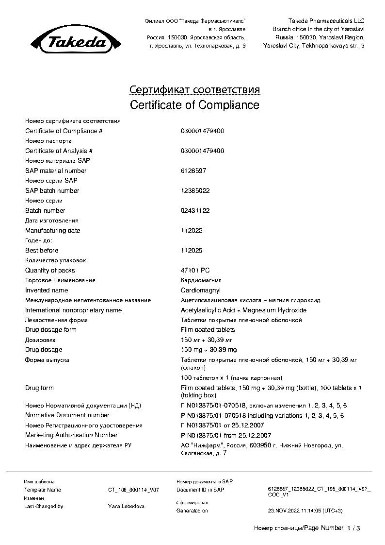 Для профилактики тромбоэмболии после хирургических вмешательств на сосудах (аортокоронарное шунтирование, чрескожная транслюминальная коронарная ангиопластика) назначают по 1 таб. Кардиомагнила, содержащего ацетилсалициловую кислоту в дозе 75-150 мг 1 раз/сут.