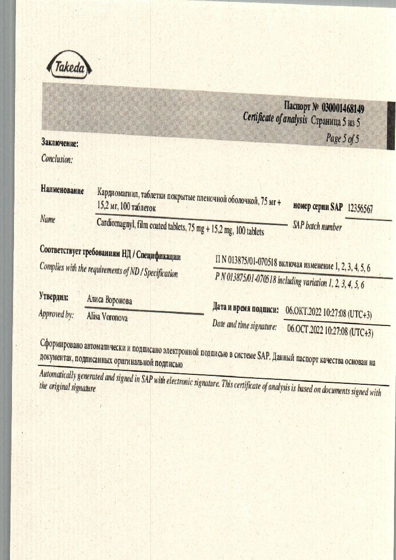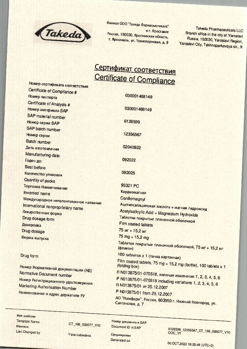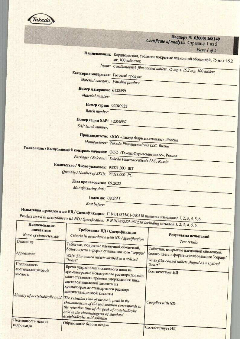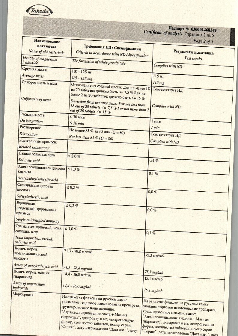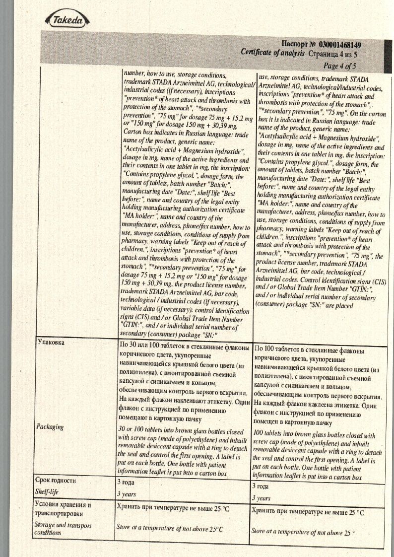 Действующие вещества: Ацетилсалициловая кислота 75 мг, Магния гидроксид 15,2 мг.