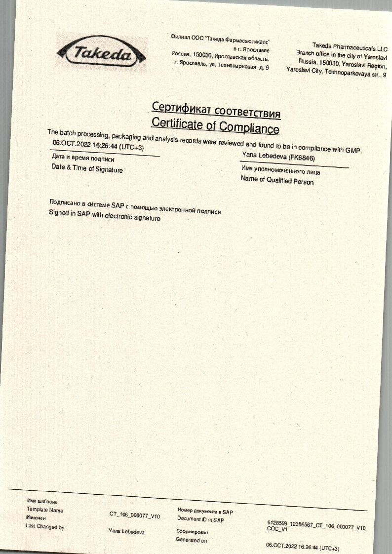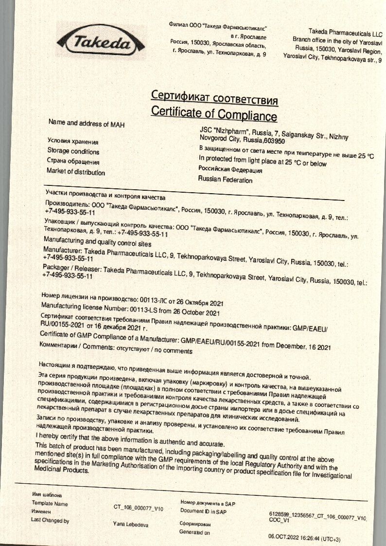Оболочка: Гипромеллоза (метил-гидроксипропил-целлюлоза 15) 460 мкг, Пропиленгликоль 90 мкг, Тальк 280 мкг.