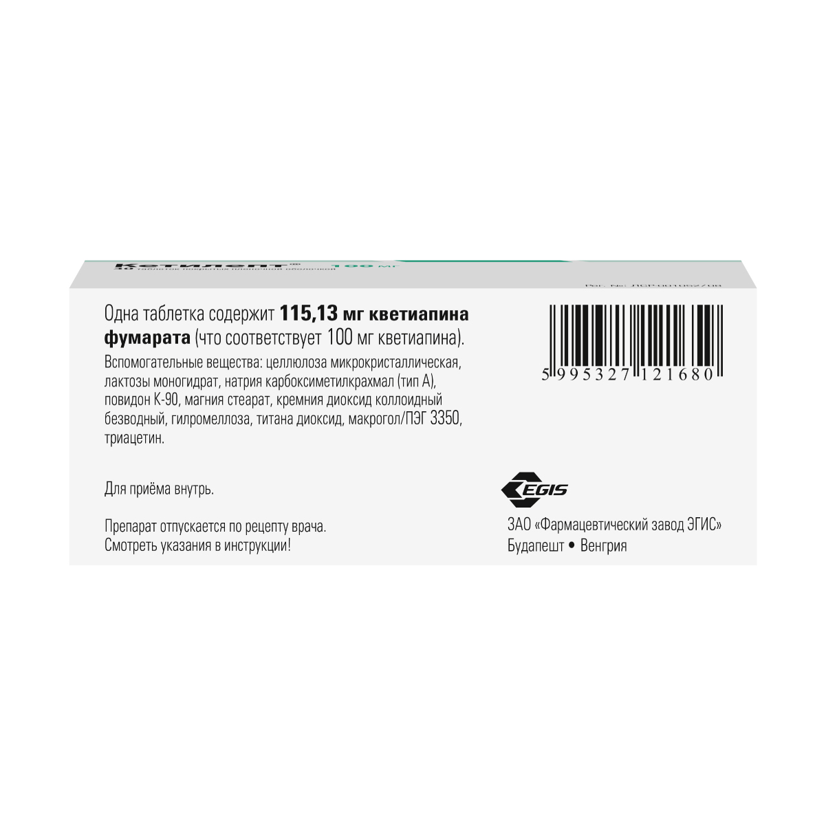 Активное вещество: кветиапин 100 мг (в виде кветиапина фумарата),