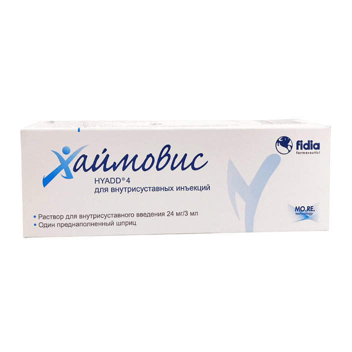 Препарат «Хаймовис» представляет собой гидрогель, который производится в соответствии с требованиями Надлежащей производственной практики (Good Manufacturing Practice, GMP) и содержит HYADD 4, новую молекулу, запатентованную компанией Fidia, в концентрации 8 мг/мл. HYADD 4 представляет собой новое производное гиалуроновой кислоты: частичный гексадециламид гиалуроновой кислоты (частичный в связи с очень низким уровнем модификации гиалуроновой кислоты, приблизительно в 3% молярной концентрации для сохранения биологической совместимости).Такая структура придает препарату «Хаймовис» специальные свойства, в том числе длительное время задержки, а также вязко-эластические свойства в дополнение к превосходным смазывающим свойствам препарата.