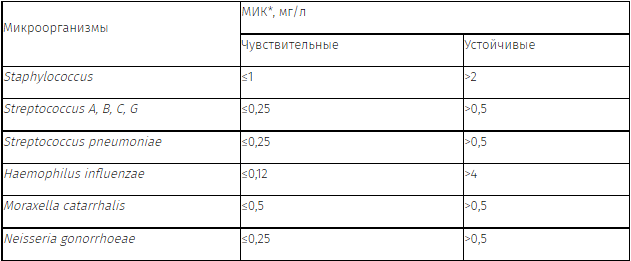 - аэробные грамотрицательные микроорганизмы: Haemophilus influenzae, Haemophilus parainfluenzae, Legionella pneumophila, Moraxella catarrhalis, Pasteurella multocida, Neisseria gonorrhoeae;