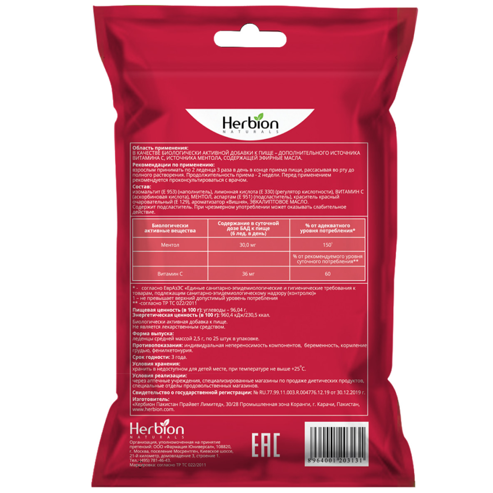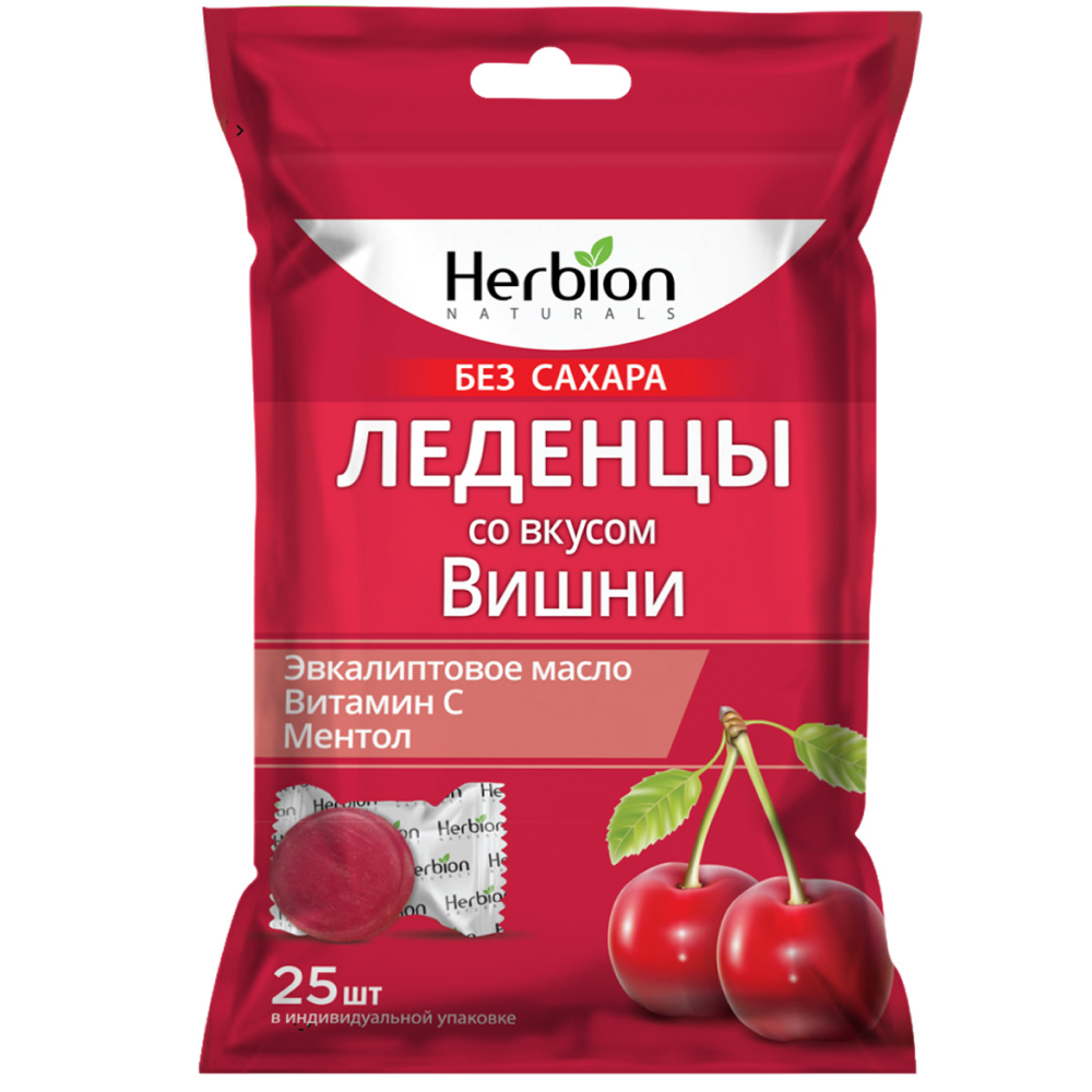 HERBION ЛЕДЕНЦЫ СО ВКУСОМ ВИШНИ БЕЗ САХАРА - Биологически активная добавка (БАД) к пище - полезная сладость. Вкусно и без сахара.