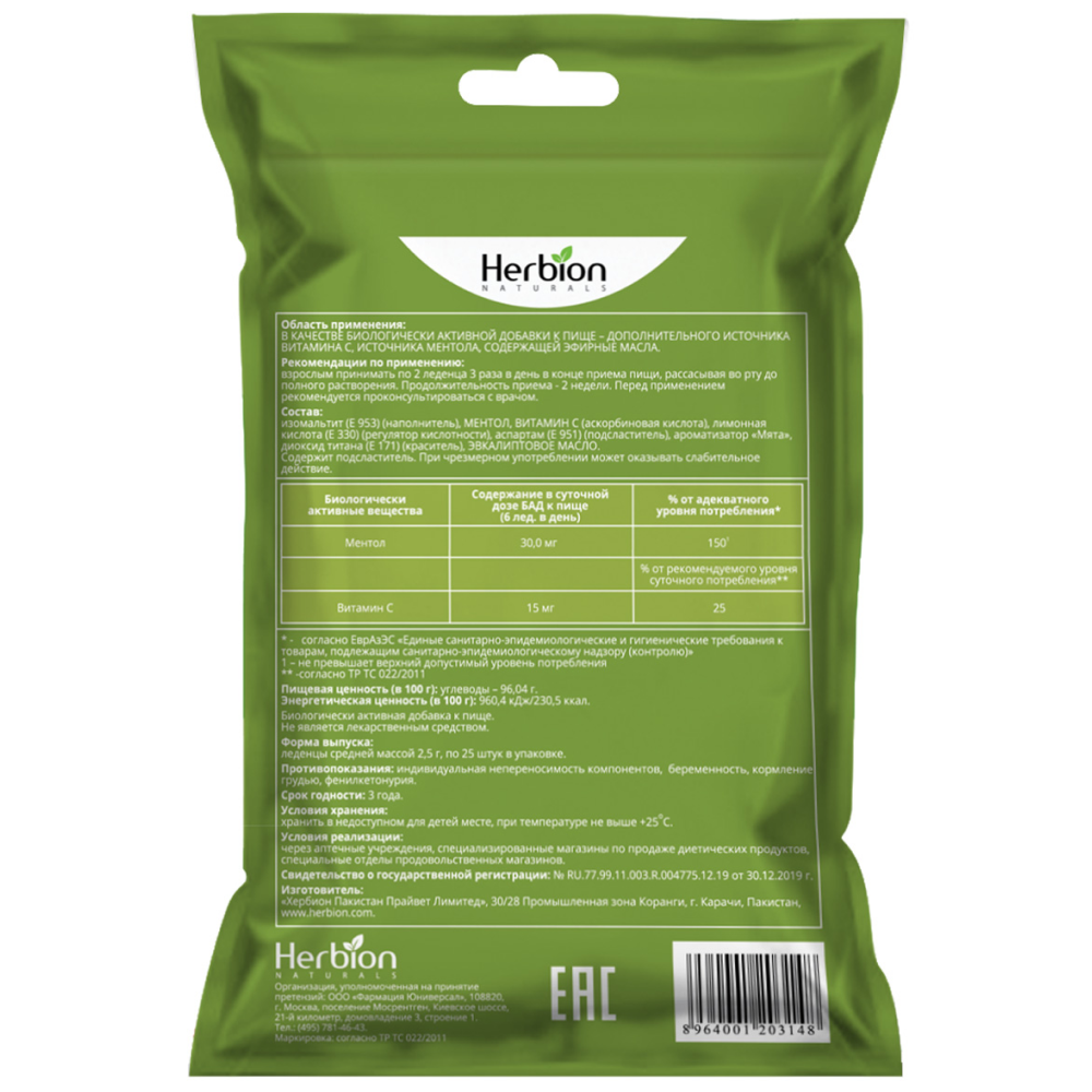 Леденцы Herbion изготовлены по уникальной рецептуре, в составе масло эвкалипта и витамин С.