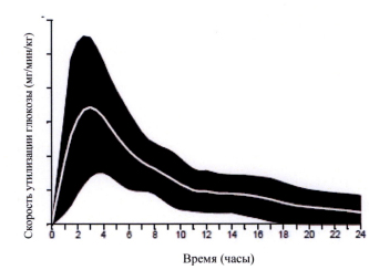 Типичная кривая активности инсулина (кривая утилизации глюкозы) изображена на рисунке ниже в виде линии. Изменения времени действия и/или активности инсулина, которые могут наблюдаться у пациента, изображены в виде заштрихованной области.
