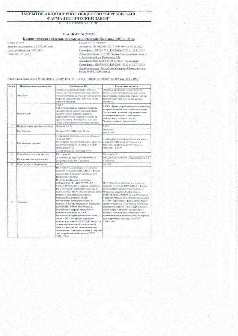 1 таблетка содержит: активное вещество: кларитромицин 500,0 мг; вспомогательные вещества (ядро): целлюлоза микрокристаллическая 50,0 мг, крахмал картофельный 20,0 мг, повидон-К25 26,0 мг, карбоксиметилкрахмал натрия 40,0 мг, магния стеарат 4,0 мг; вспомогательные вещества (оболочка): гипромеллоза 10,8 мг, макрогол-4000 3,2 мг, титана диоксид 6,0 мг.