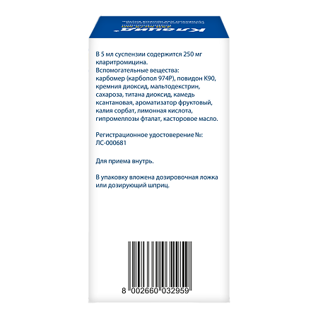 Способ применения и режим дозирования конкретного препарата зависят от его формы выпуска и других факторов. Оптимальный режим дозирования определяет врач. Следует строго соблюдать соответствие используемой лекарственной формы конкретного препарата показаниям к применению и режиму дозирования. Индивидуальный. При приеме внутрь для взрослых и детей старше 12 лет разовая доза составляет 0.25-1 г, частота приема 2 раза/сут. Для детей младше 12 лет суточная доза составляет 7.5-15 мг/кг/сут в 2 приема. У детей кларитромицин следует применять в соответствующей лекарственной форме, предназначенной для данной категории пациентов. Длительность лечения зависит от показаний. Пациентам с нарушениями функции почек (КК менее 30 мл/мин или уровень сывороточного креатинина более 3.3 мг/дл) дозу следует уменьшить в 2 раза или удвоить интервал между приемами. Максимальные суточные дозы: для взрослых - 2 г, для детей - 1 г.