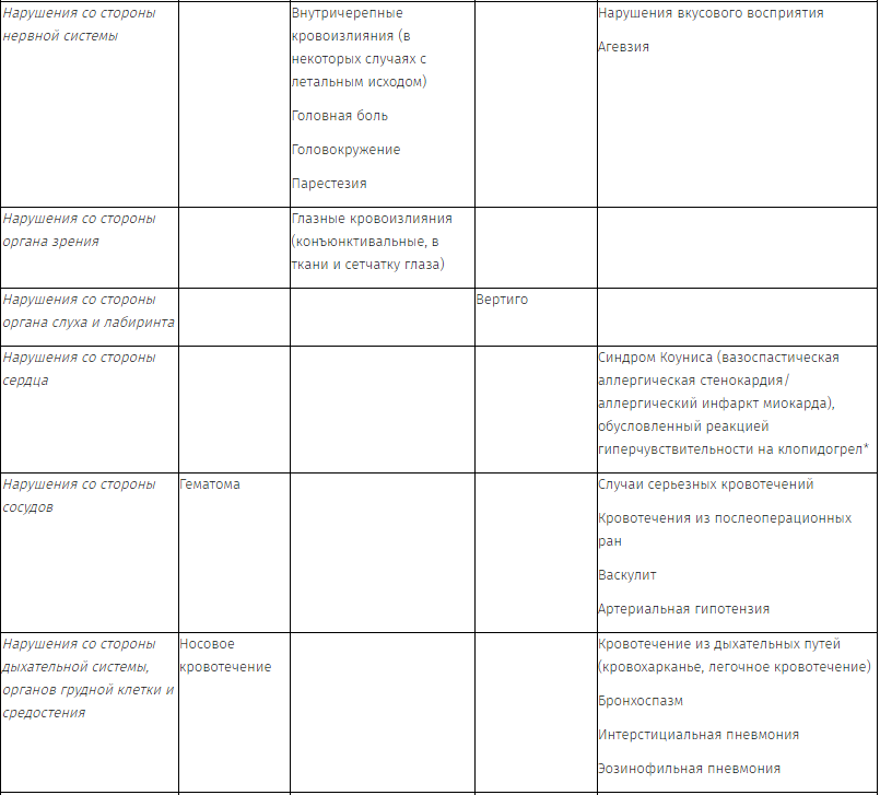 Общая частота кровотечений другой локализации при приеме клопидогрела по сравнению с приемом АСК была выше (7,3 % против 6,5 %, соответственно). Однако частота тяжелых кровотечений при применении клопидогрела и АСК была сопоставимой (0,6 % или 0,4 %, соответственно). Наиболее часто сообщалось о развитии следующих кровотечений: пурпура/кровоподтеки, носовое кровотечение. Реже сообщалось о развитии гематом, гематурии и глазных кровоизлияний (главным образом, конъюнктивальных). Частота внутричерепных кровоизлияний при применении клопидогрела и АСК была сопоставимой (0,4 % или 0,5 %, соответственно).