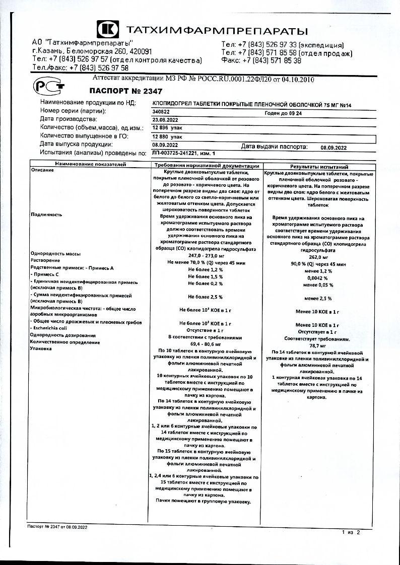 В течение 120 ч после приема внутрь человеком 14С-меченого клопидогрела около 50 % принятой дозы выводится через почки и приблизительно 46 % - через кишечник. После однократного приема внутрь дозы 75 мг Т1/2 клопидогрела составляет приблизительно 6 ч. После однократного приема и приема повторных доз клопидогрела Т1/2 его основного циркулирующего в крови неактивного метаболита составляет 8 ч.