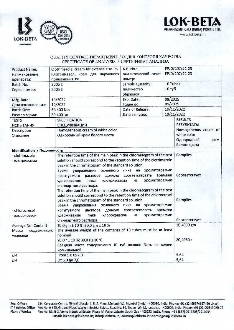 Клотримазол является противогрибковым: средством широкого спектра действия для местного применения. Антимикотический эффект клотримазола (производное имидазола) связан с нарушением синтеза эргостерина, входящего в состав клеточной мембраны грибов, что изменяет проницаемость мембраны и вызывает последующий лизис клетки. Клотримазол эффективен в отношении дерматофитов, дрожжеподобных и плесневых грибов, а также возбудителя разноцветного лишая (Pityriasis versicolor) и возбудителя эритразмы. Клотримазол оказывает антимикробное действие в отношении грамположительных (стафилококки, стрептококки) и грамотрицательных бактерий (Bacteroides, Gardnerella vaginalis), а также в отношений Trichomonas vaginalis, Corynebacterium minutissimum.