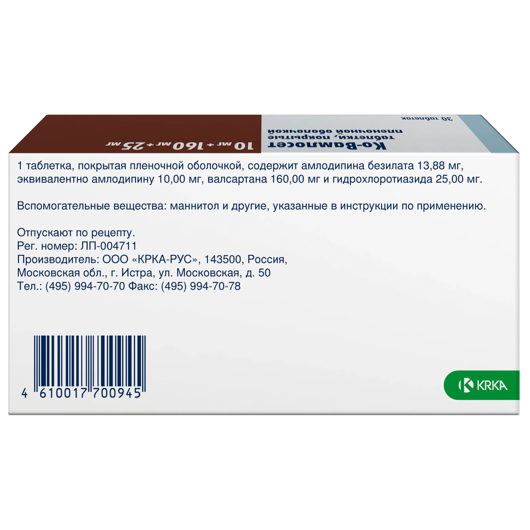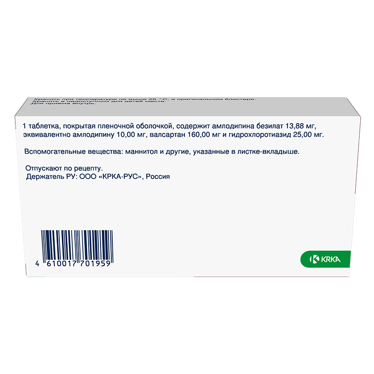 Амлодипина безилат (амлодипина бесилат) 13.88 мг, эквивалентно амлодипину 10,00 мг, Валсартан А, субстанция-гранулы 251,35 мг [Действующее вещество субстанции-гранул: валсартан 160,00 мг Вспомогательные вещества субстанции-гранул: целлюлоза микрокристаллическая (тип 200), кроскармеллоза натрия, повидон К-25, натрия лаурилсульфат], Гидрохлоротиазид 25,00 мг.