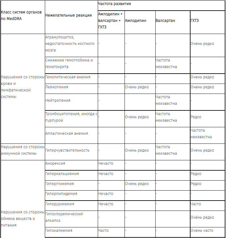 Следующие нежелательные реакции, классифицированные по классам систем органов MedDRA и частоте встречаемости, относятся к комбинации амлодипин + валсартан + ГХТЗ и амлодипину, валсартану и ГХТЗ по отдельности.