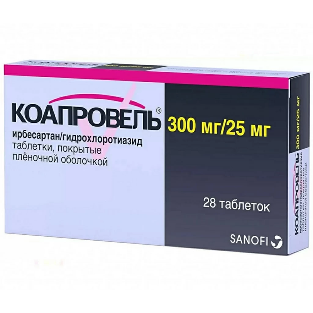 Коапровель® 300 мг/25 мг (1 таб., содержащая ирбесартан/гидрохлоротиазид 300 мг/25 мг соответственно или 2 таб., содержащие ирбесартан/гидрохлоротиазид 150 мг/12.5 мг соответственно) рекомендуется пациентам, у которых АД недостаточно контролируется препаратом Коапровель® 300 мг/12.5 мг.