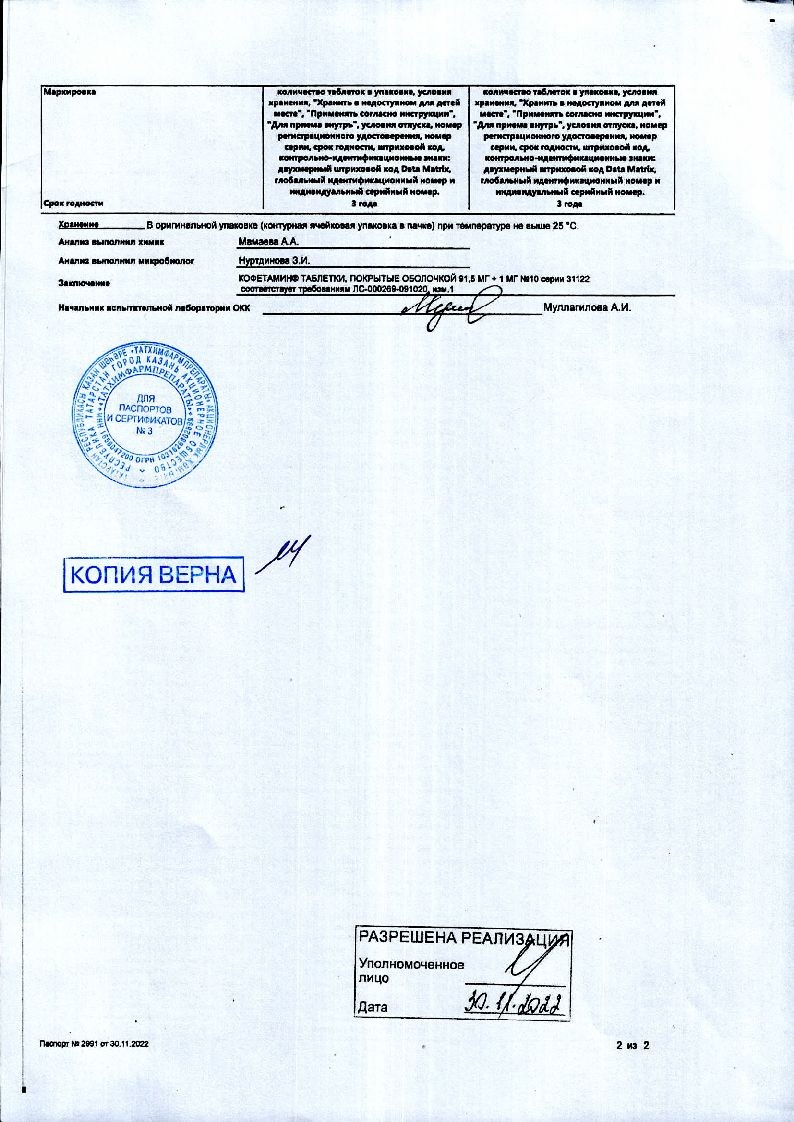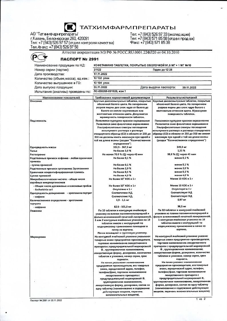 Действующие вещества: кофеин (кофеин безводный) — 91,5 мг, эрготамина тартрат — 1,0 мг.