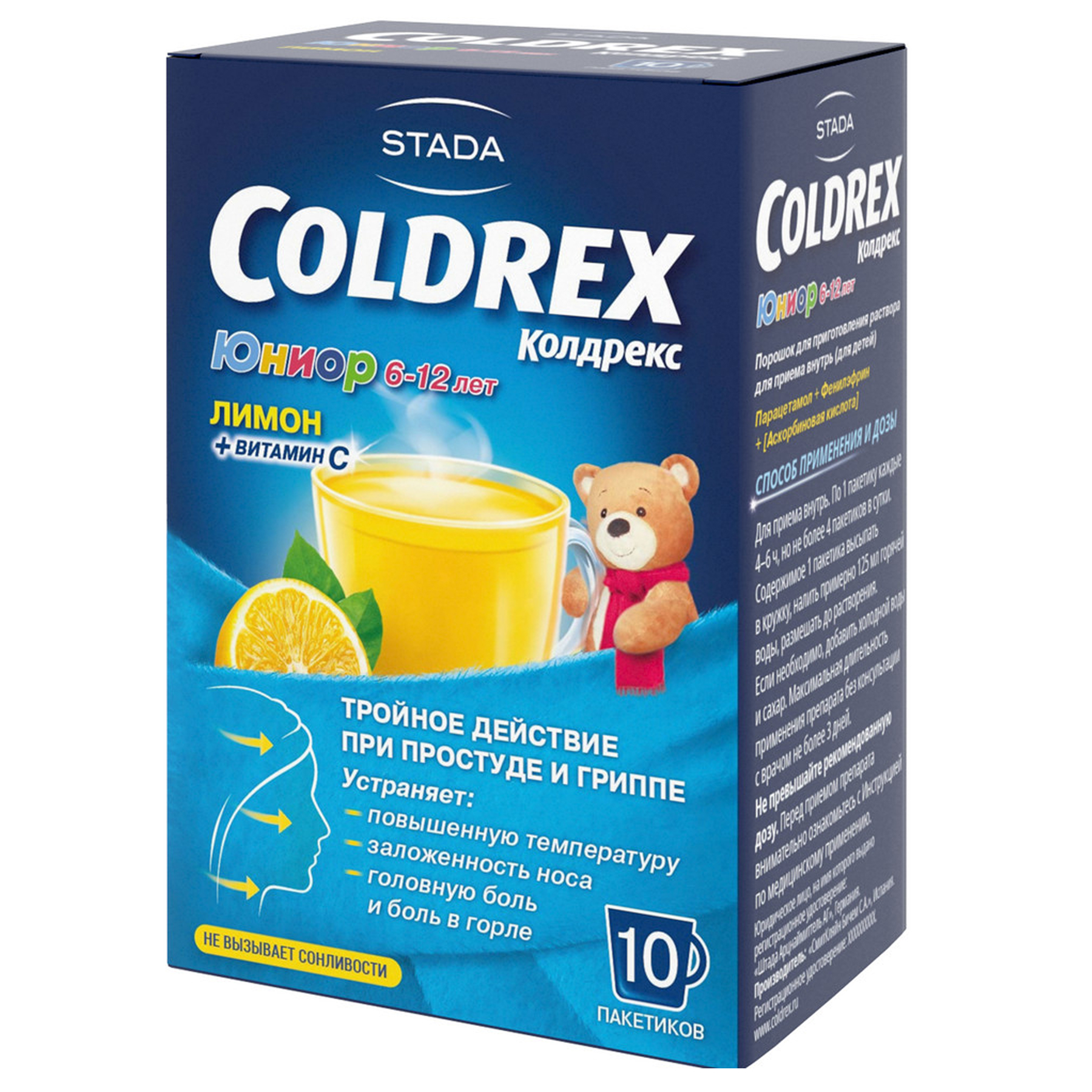 Препарат Колдрекс Юниор применяют у детей от 6 до 12 лет в качестве средства для устранения симптомов "простуды" и гриппа, включая: