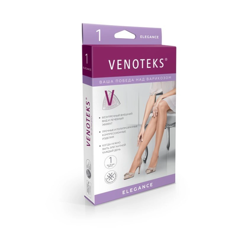 VENOTEKS ELEGANCE предотвращают ;усталость и тяжесть в ногах, снимают небольшие отёки и другие начальные проявления заболевания вен. Колготки рекомендованы для профилактики и при начальных стадиях поражения вен на уровне бедра, подколенной ямки голени и/или стопы у беременных женщин.