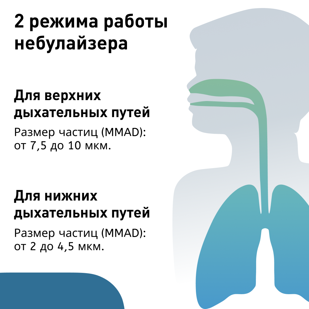 Зелёная крышка небулайзерной камеры образует аэрозоль с крупной каплей, поэтому подходит для лечения заболеваний верхних дыхательных путей: ринита, синусита, фарингита, ларингита. Синяя крышка небулайзерной камеры образует аэрозоль с мелкой каплей и подходит для лечения заболеваний нижних дыхательных путей: астмы, бронхита, бронхиолита, бронхоэктазов, бронхопневмонии. Небулайзер способствует облегчению дыхания, снижает риск развития острого отита и риносинусита, позволяет уменьшить количество принимаемых лекарств.