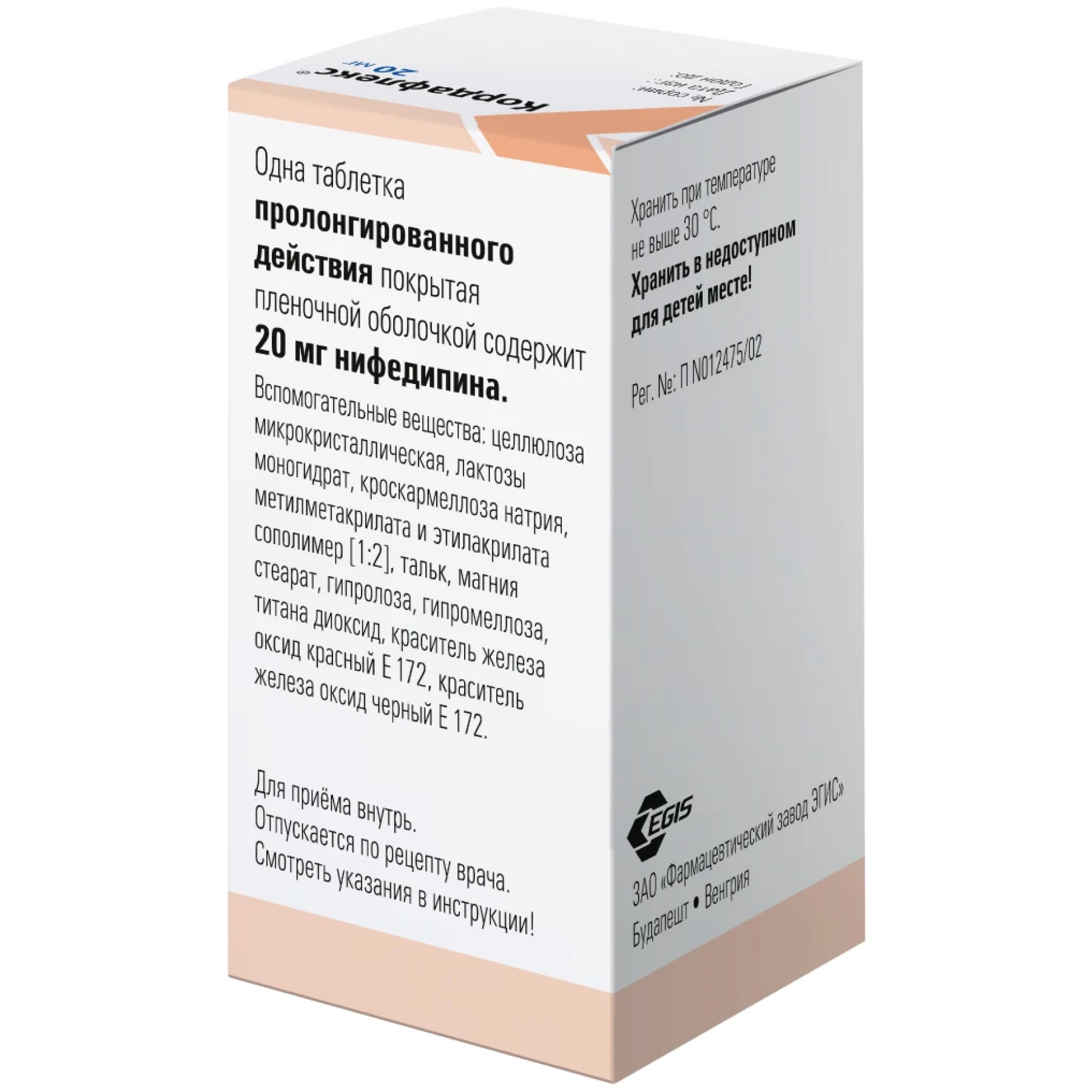 Активное вещество: нифедипин 20 мг.
