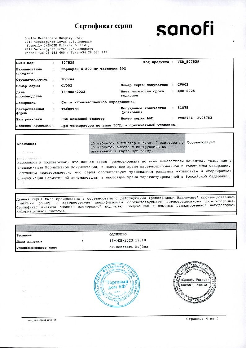 Активное вещество: амиодарона гидрохлорид 200 мг.