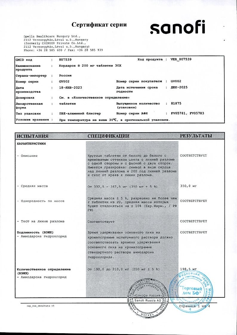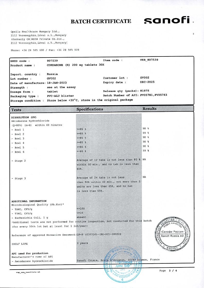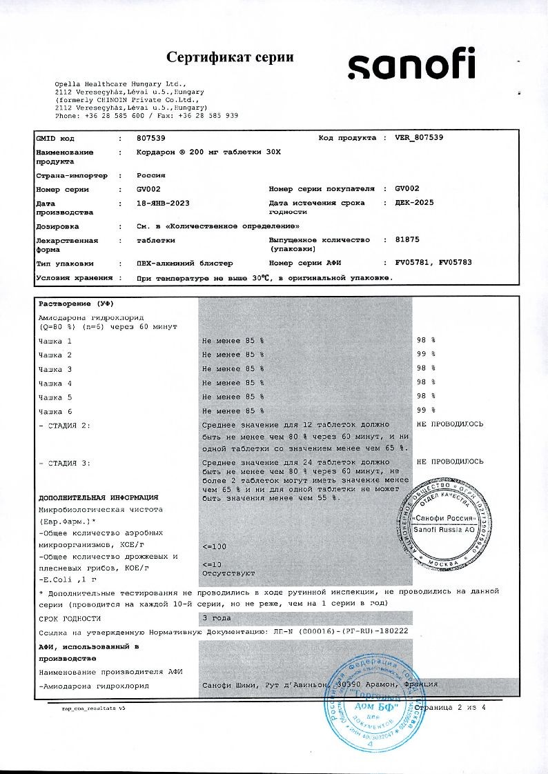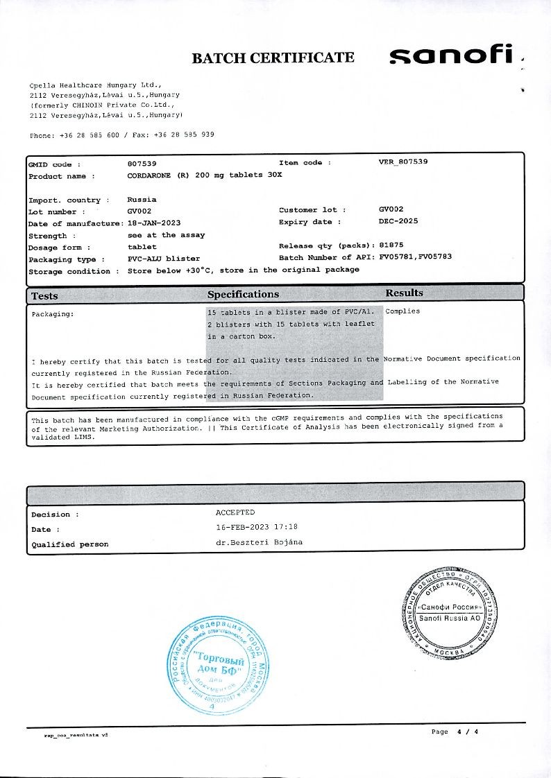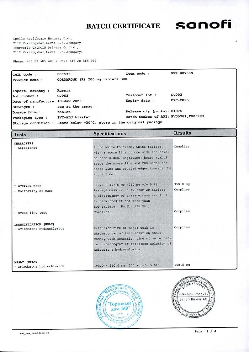Активное вещество: амиодарона гидрохлорид 200 мг.
