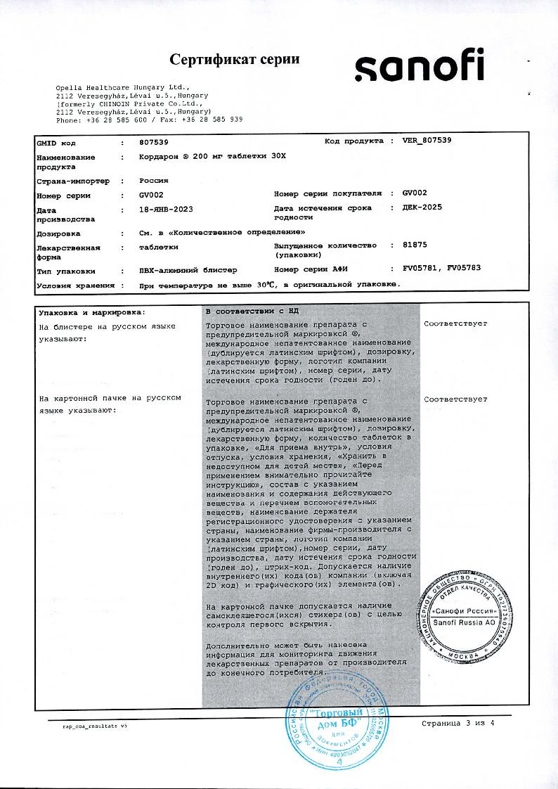 Со стороны сердечно-сосудистой системы: часто – брадикардия, обычно умеренная, выраженность которой зависит от дозы препарата; нечасто - нарушение проводимости (синоатриальная блокада, AV-блокада различных степеней), аритмогенное действие (имеются сообщения о возникновении новых аритмий или усугублении существующих, в некоторых случаях - с последующей остановкой сердца); на основании имеющихся данных невозможно определить, вызвано ли возникновение этих нарушений ритма действием препарата Кордарон®, тяжестью сердечно-сосудистой патологии или является следствием неэффективности лечения. Эти эффекты наблюдаются в основном в случаях применения препарата Кордарон® совместно с лекарственными препаратами, удлиняющими период реполяризации желудочков сердца (интервал QTс) или при нарушениях содержания электролитов в крови.