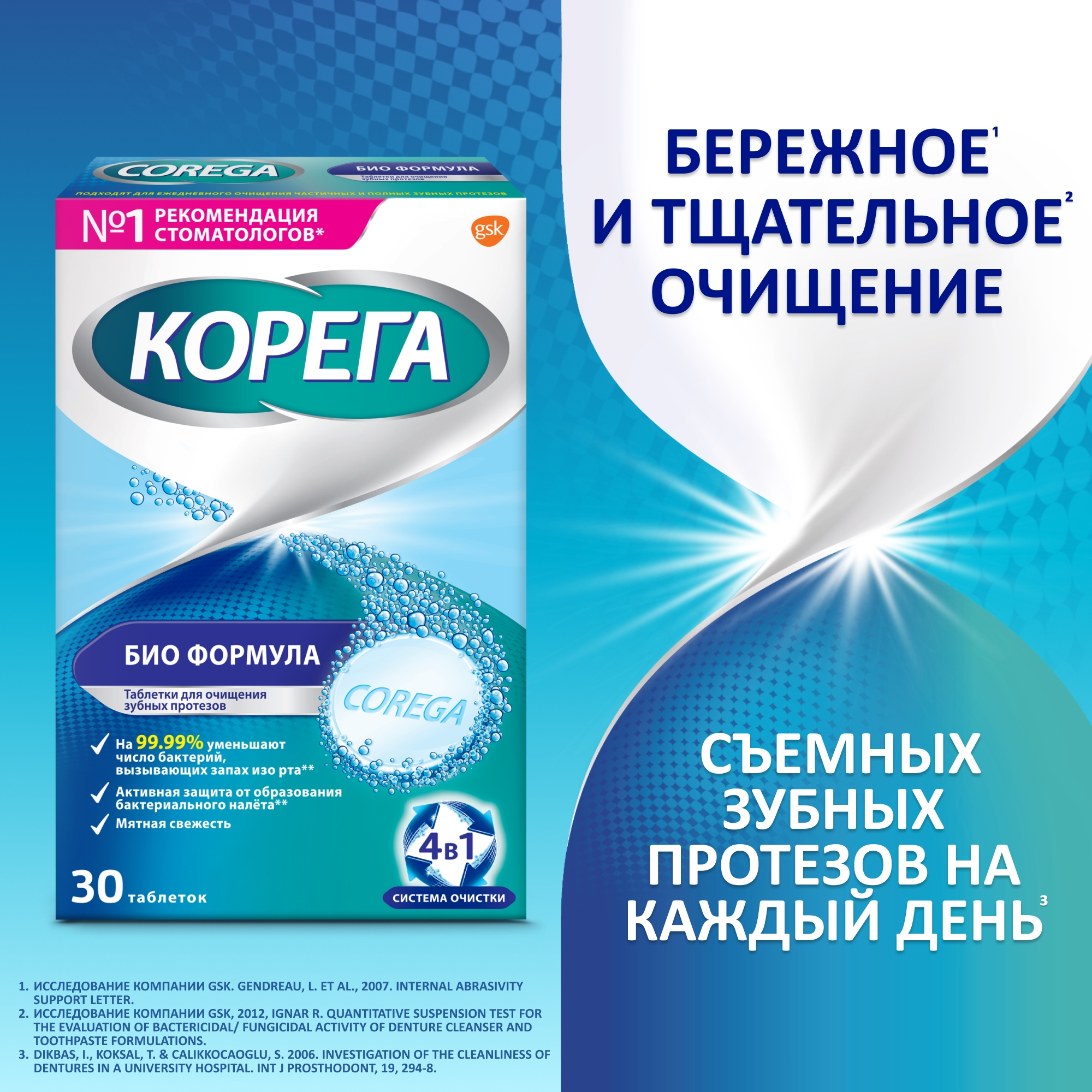 При ежедневном двухразовом использовании таблетки Корега, растворяясь, удаляют пятна с зубных протезов, которые возникли в результате употребления пищи или курения. Таблетки Корега оказывают антибактериальный и дезинфицирующий эффект и помогают предотвратить возникновение налета и воспаления.