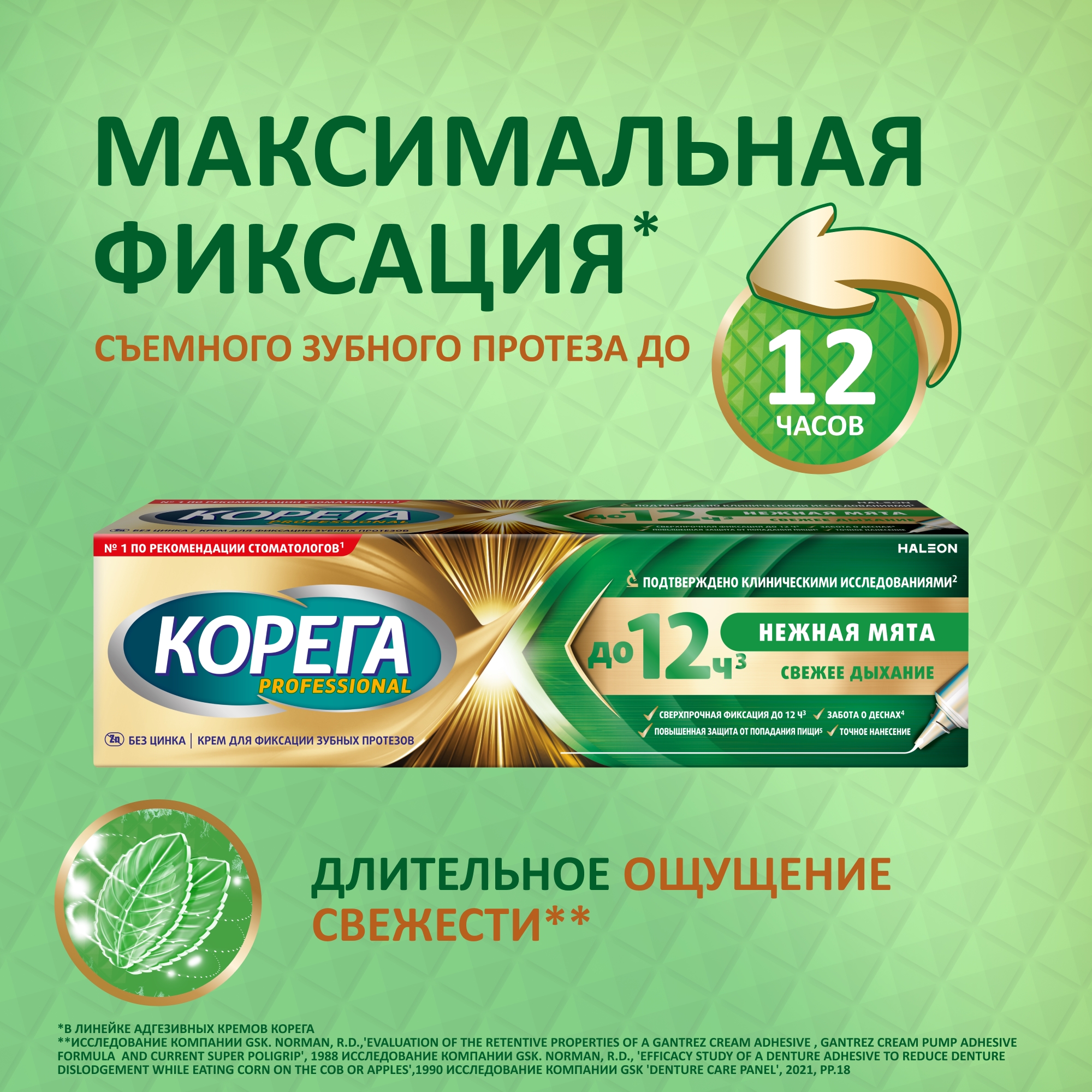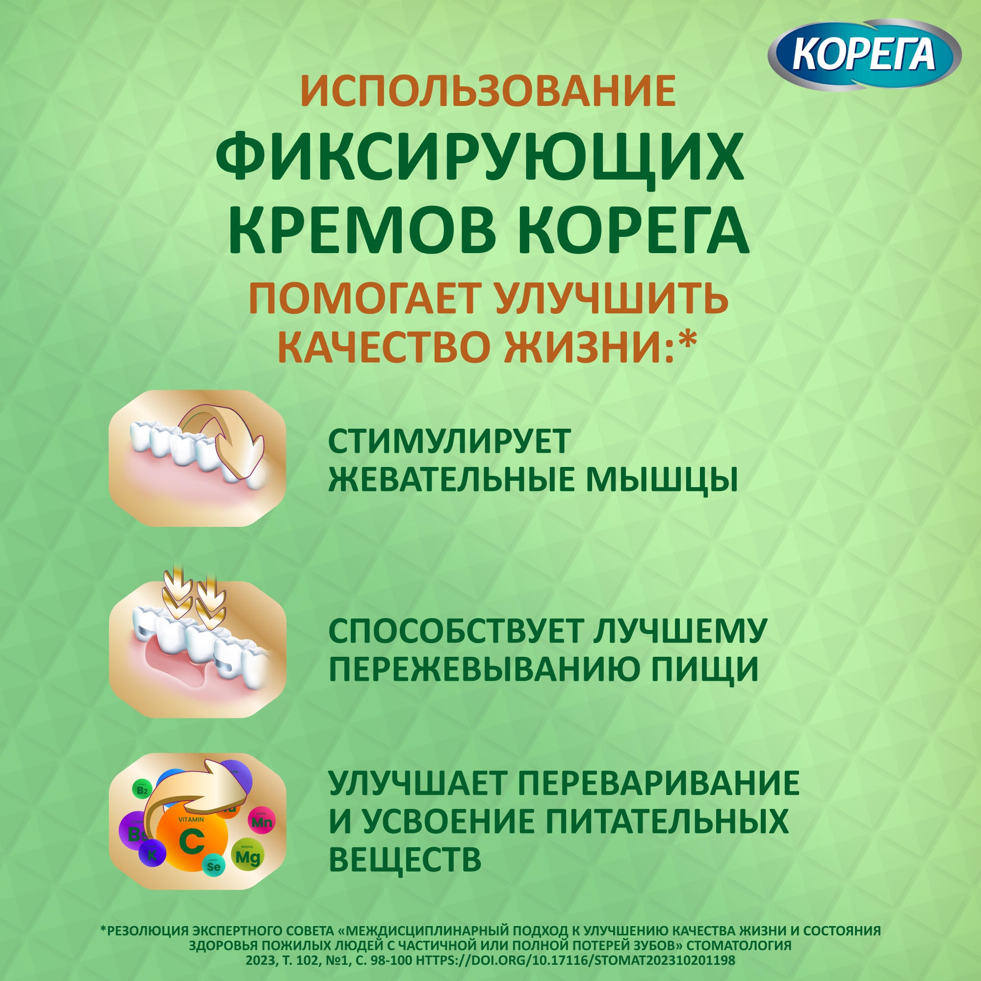 Корега Крем для фиксации зубных протезов максимальная фиксация+свежесть - клинически доказано, что крем для фиксации зубных протезов Корега обеспечивает фиксацию зубного протеза до 12 часов и длительную свежесть в полости рта.