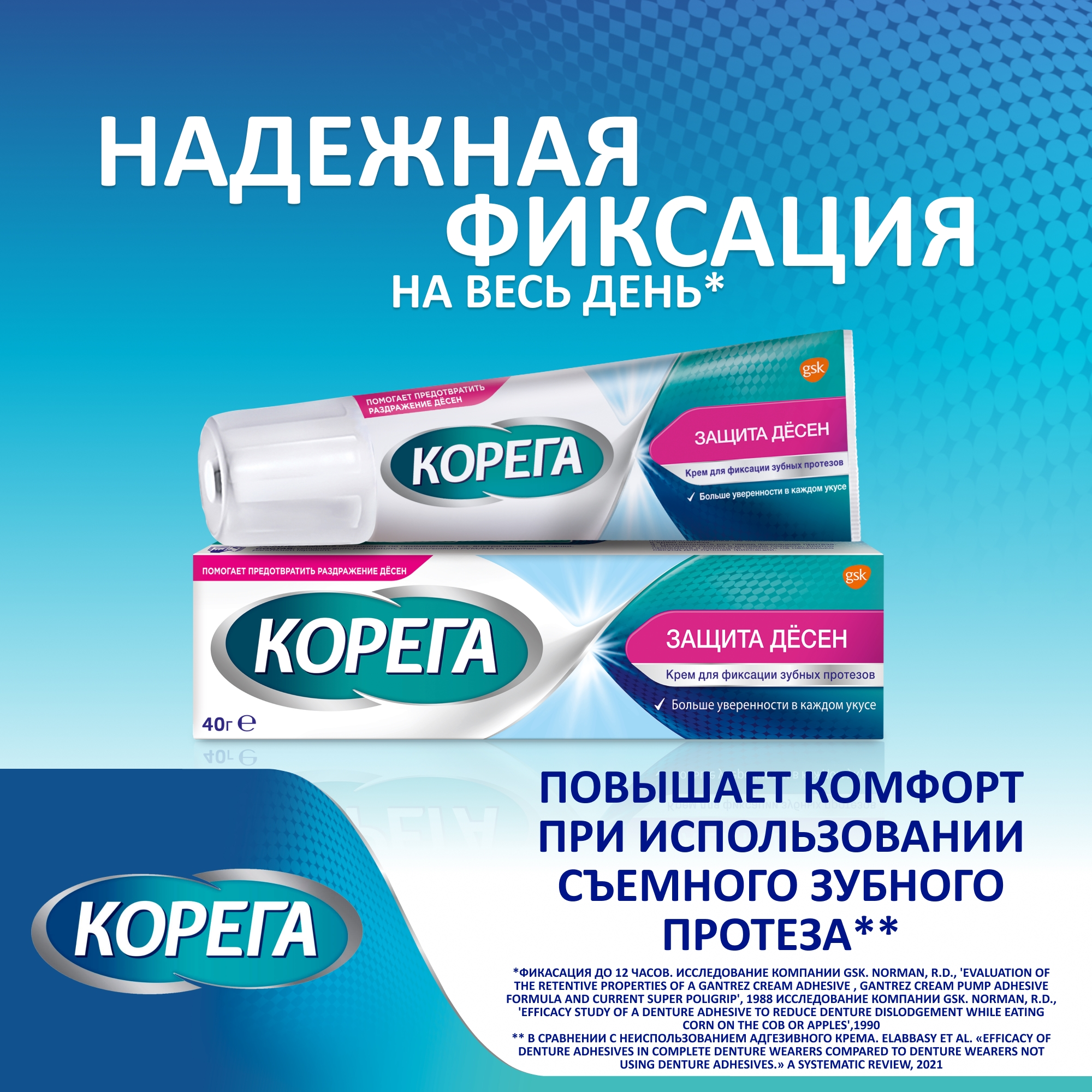 Средство для фиксации зубных протезов Корега Защита десен не содержит искусственных красителей. Он обеспечивает надежную фиксацию зубного протеза в течение всего дня и имеет вкус, не отражающийся на вкусовых качествах употребляемой вами пищи. Крем Защита десен значительно снижает раздражение десен и способствует комфортному использованию зубных протезом. Кроме того, продукт не содержит цинк.