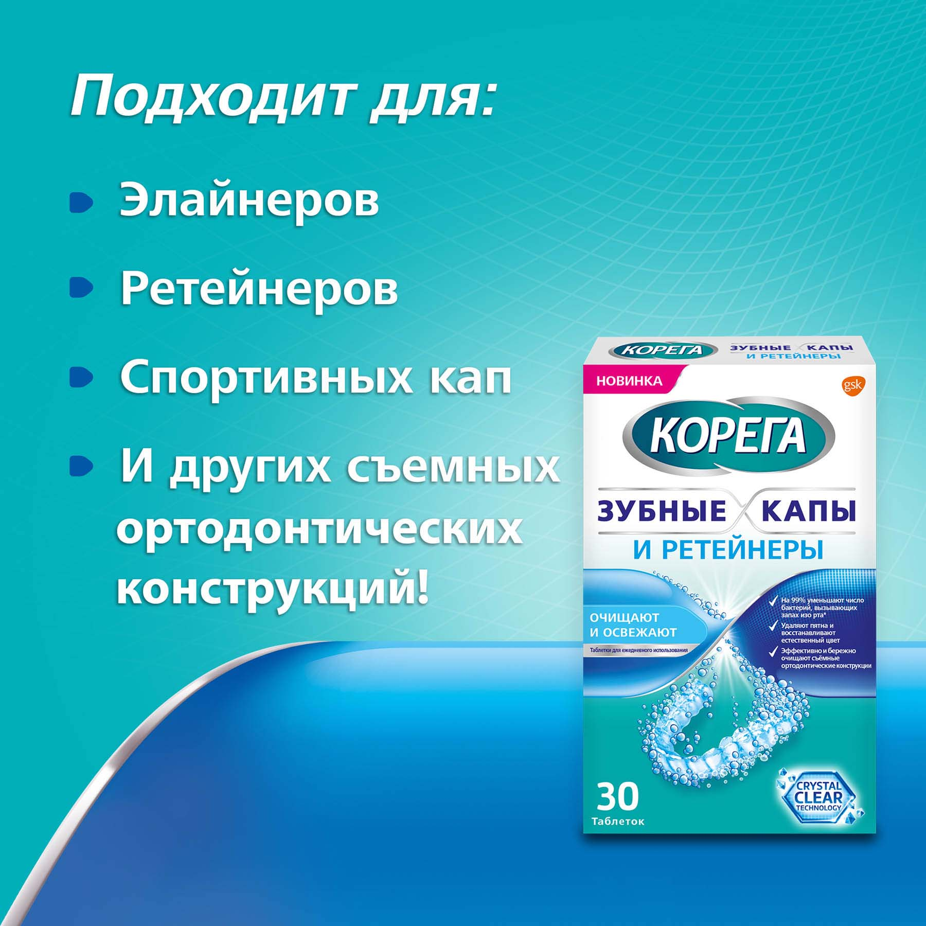 Таблетки для очищения зубных протезов Корега. Таблетки Корега уменьшают число бактерий и удаляют с поверхности протеза сложные загрязнения и налет, при этом они безопасны для регулярного применения, бережно очищают зубной протез, по сравнению с чисткой обычной зубной пастой. Таблетки Корега являются мощным средством, которое бережно очищает зубные протезы, эффективно удаляет бактерии. Использование таблеток Корега обеспечивает свежесть и чистоту ваших зубных протезов. С их помощью вы можете есть, говорить и улыбаться уверенно. Корега Зубные капы и Ретейнеры с технологией Crystal Clear Мягкая формула, которая не содержит абразивов уничтожает бактерии, удаляет пятна, восстанавливает естественный цвет и помогает поддерживать чистоту вашей съёмной ортодонтической конструкции.