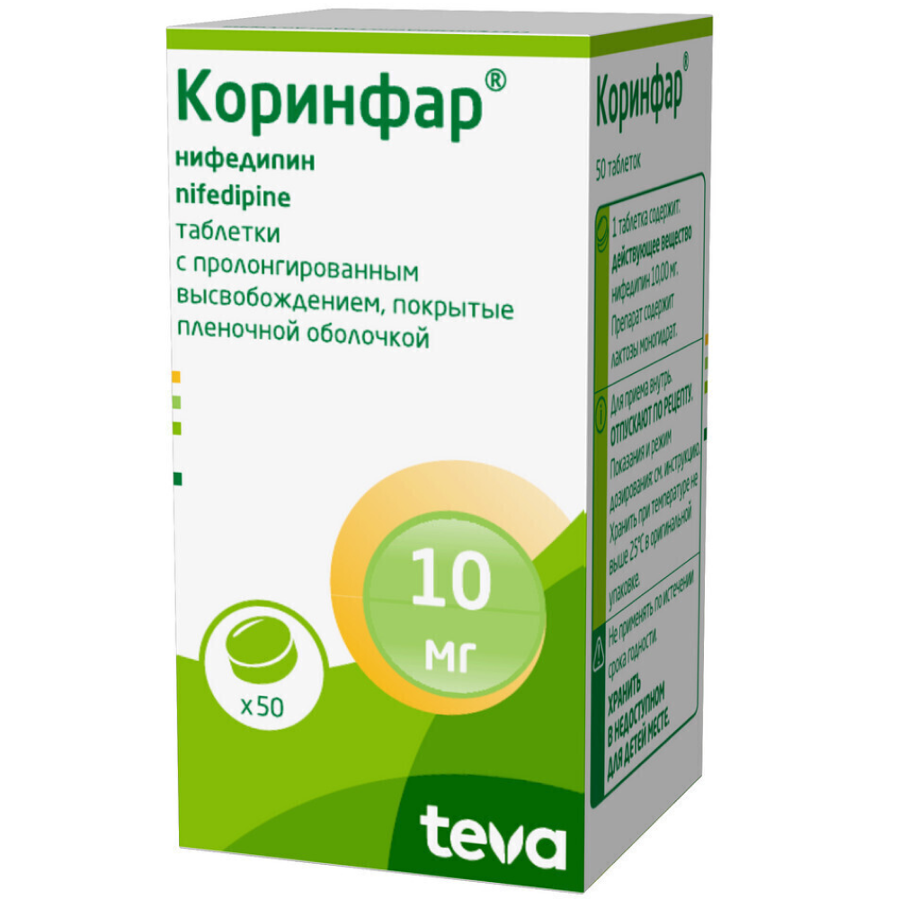 Активное вещество: нифедипин 10 мг.
