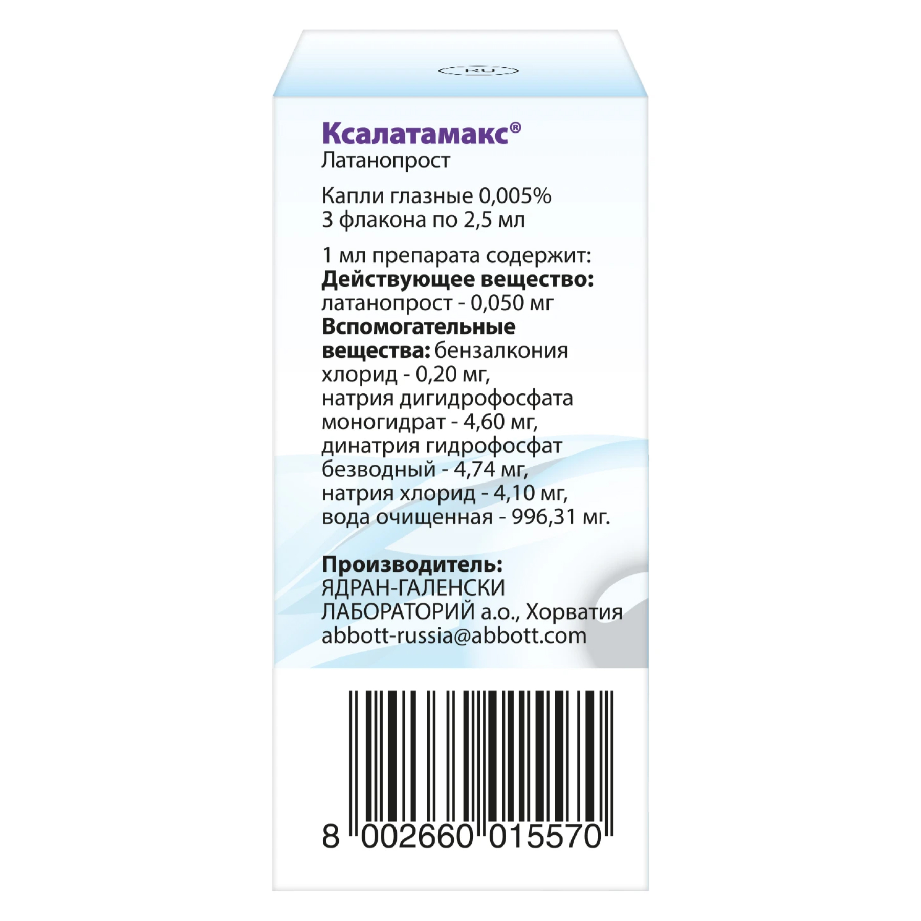 Лечение препаратом Ксалатамакс® также может вызывать постепенные изменения ресниц и пушковых волос, такие как удлинение, утолщение, усиление пигментации, увеличение густоты и изменение направления роста ресниц. Изменения ресниц обратимы и проходят после прекращения лечения. Кроме того, возможно обратимое потемнение кожи вокруг глаз.