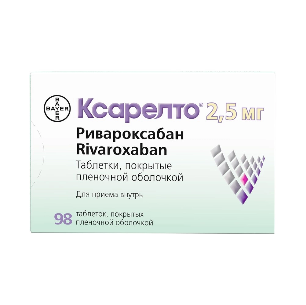 Препарат Ксарелто® 2.5 мг следует принимать по 1 таб. 2 раза/сут независимо от приема пищи.