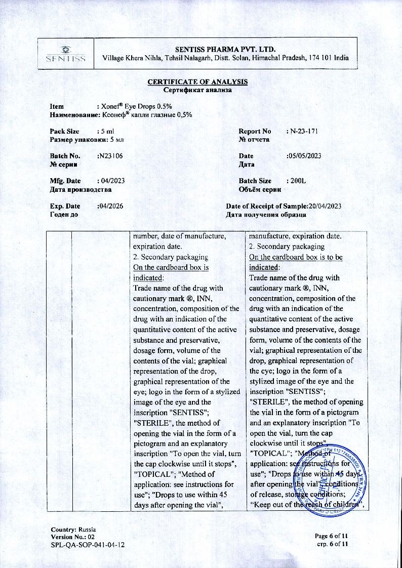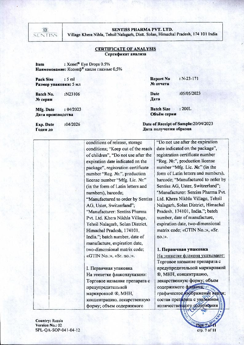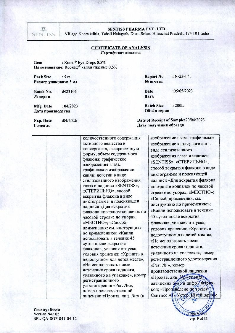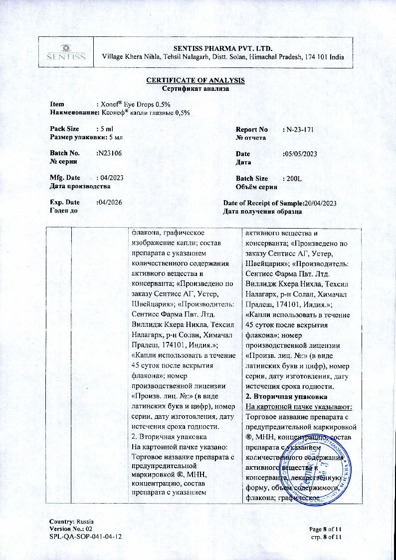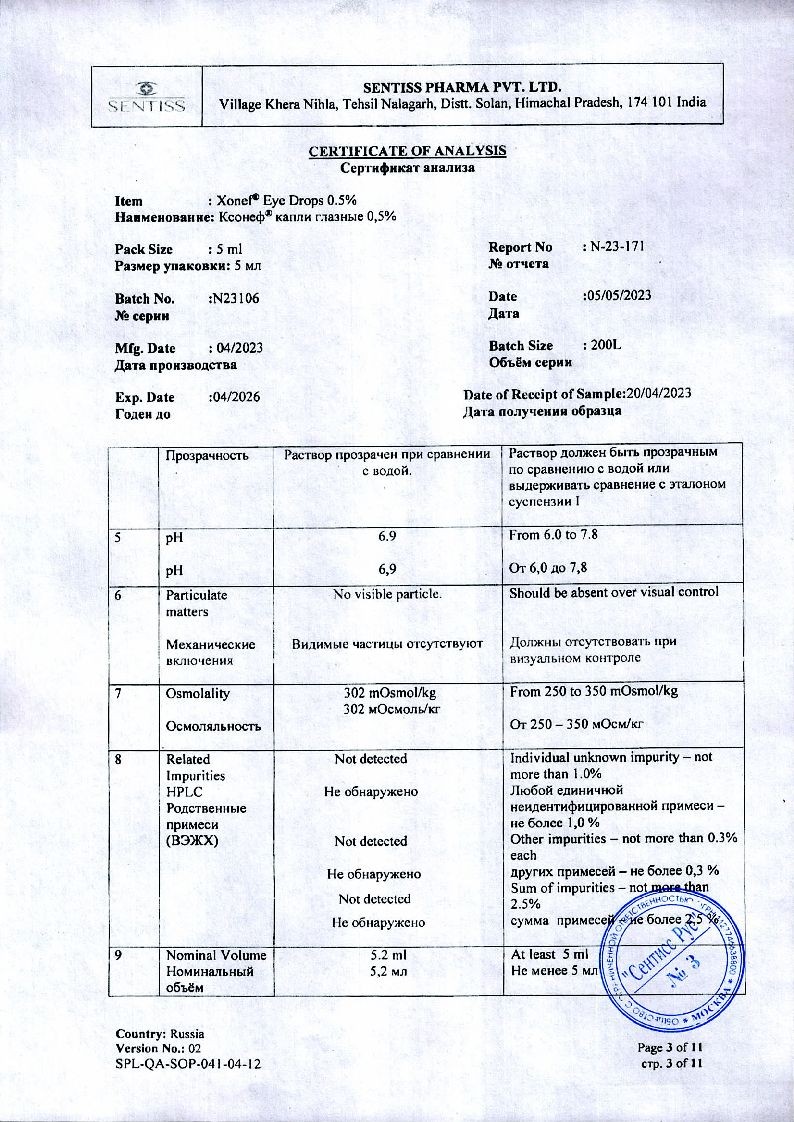 Применение глазных капель Ксонеф® не приводит к возникновению миоза, спазма аккомодации, гемералопии (в отличие от миотиков).