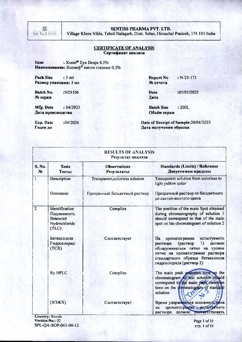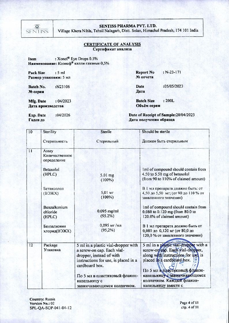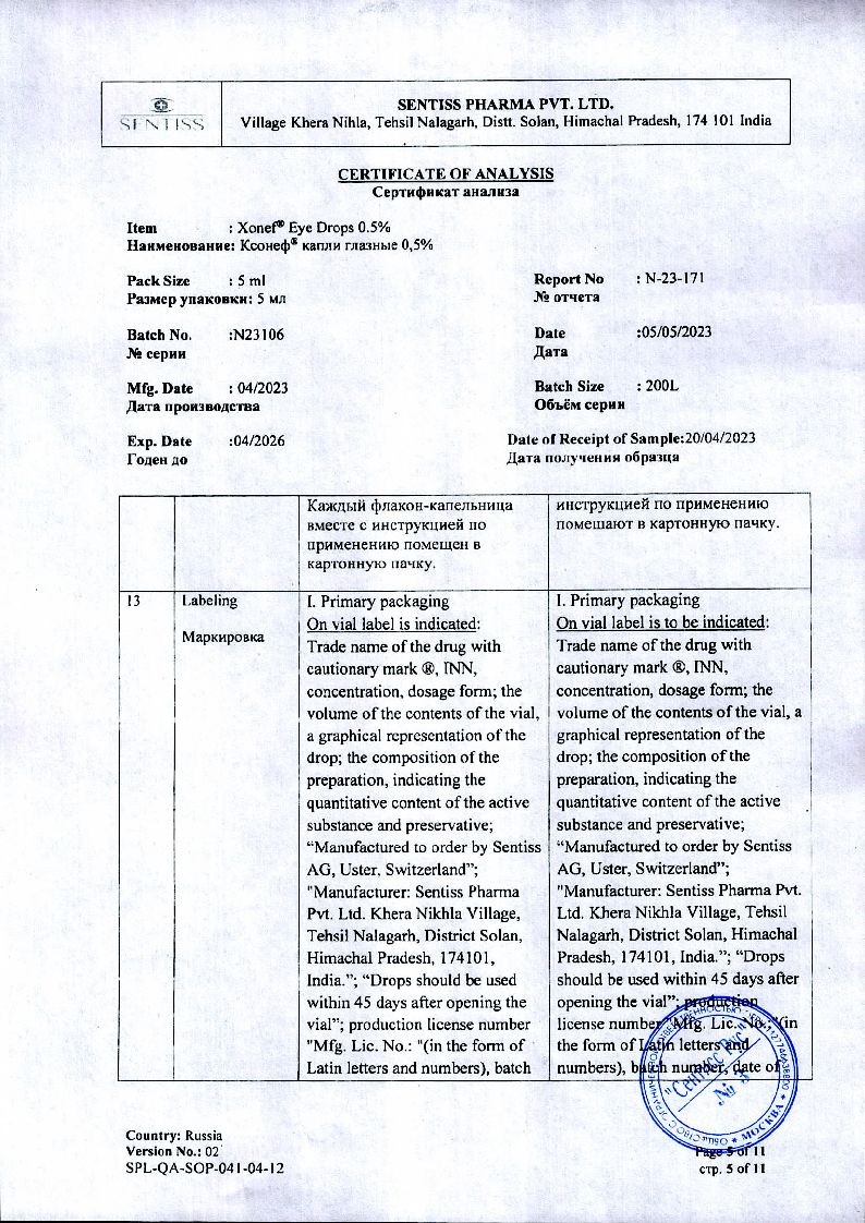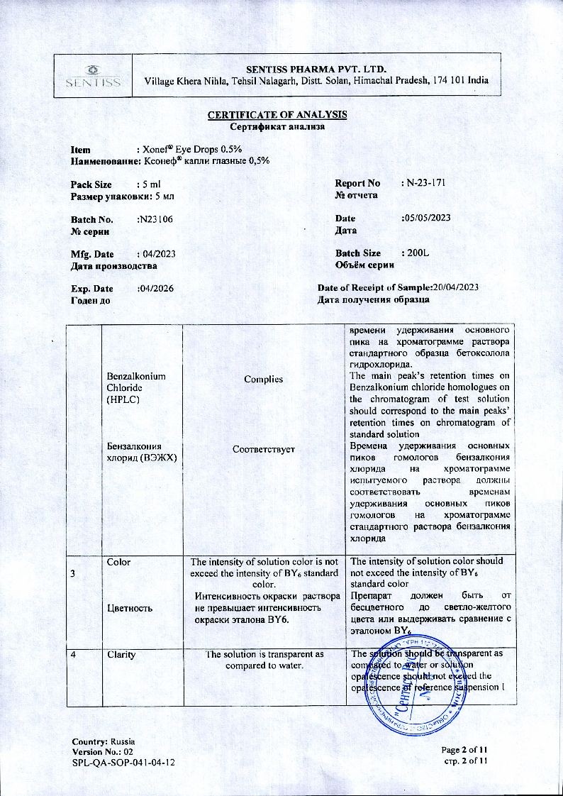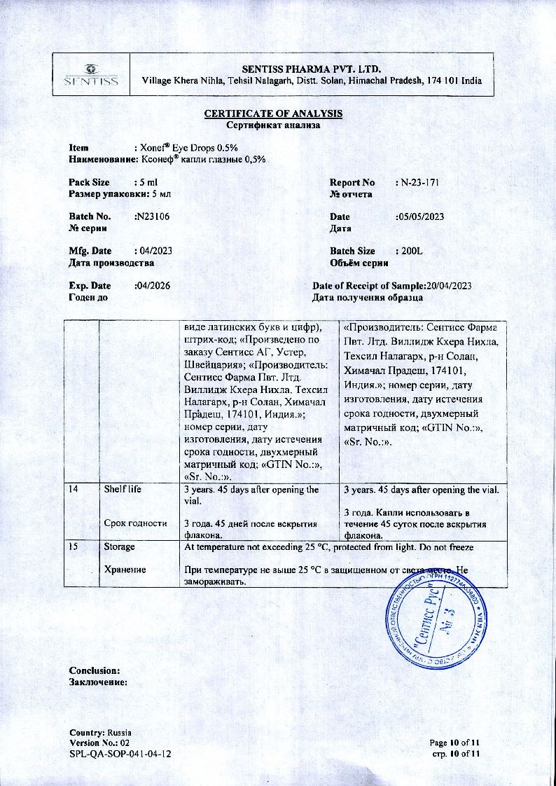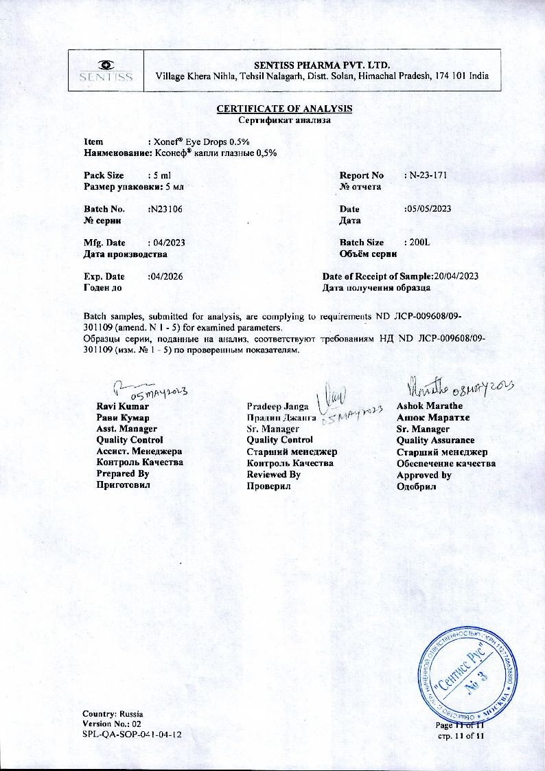 Применение глазных капель Ксонеф® не приводит к возникновению миоза, спазма аккомодации, гемералопии (в отличие от миотиков).
