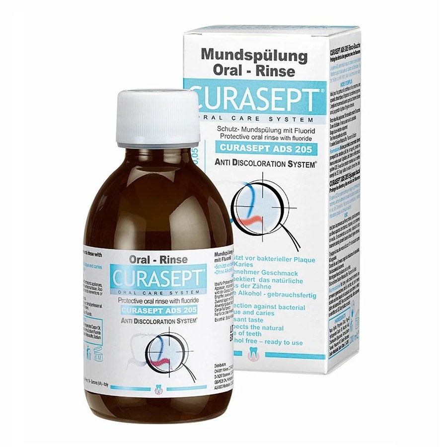 Curasept ADS 205 - ополаскиватель полости рта с хлоргексидином. Содержит 0,05% хлоргексидина и 0,05% фторида.