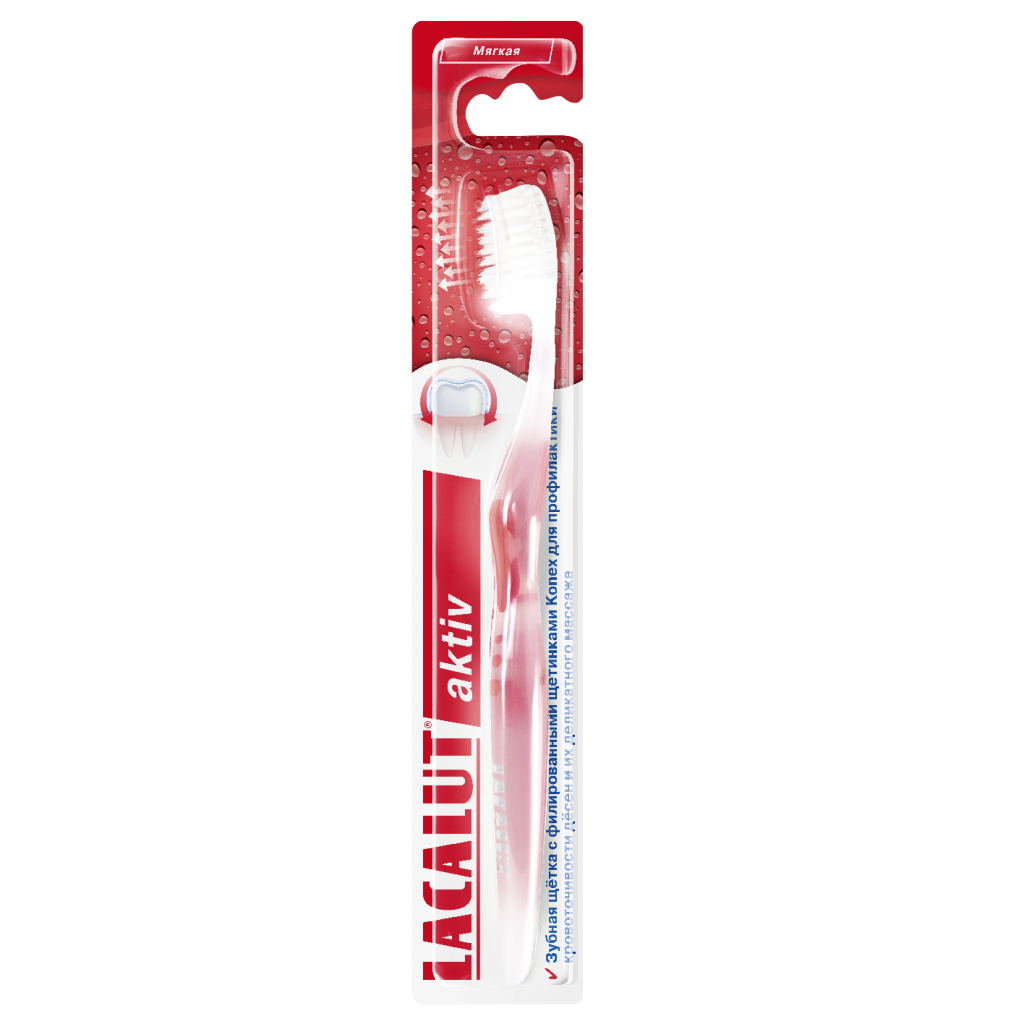 Модель выполнена из качественного прочного полипропилена в красно-белых тонах. Корпус щетки имеет нескользящую рельефную ручку, которую просто держать в руке даже ребенку. Головка имеет оптимальную длину — 30 мм, достаточную для эффективной обработки полости рта. У Лакалют актив щетинки имеют особую форму и расположение: