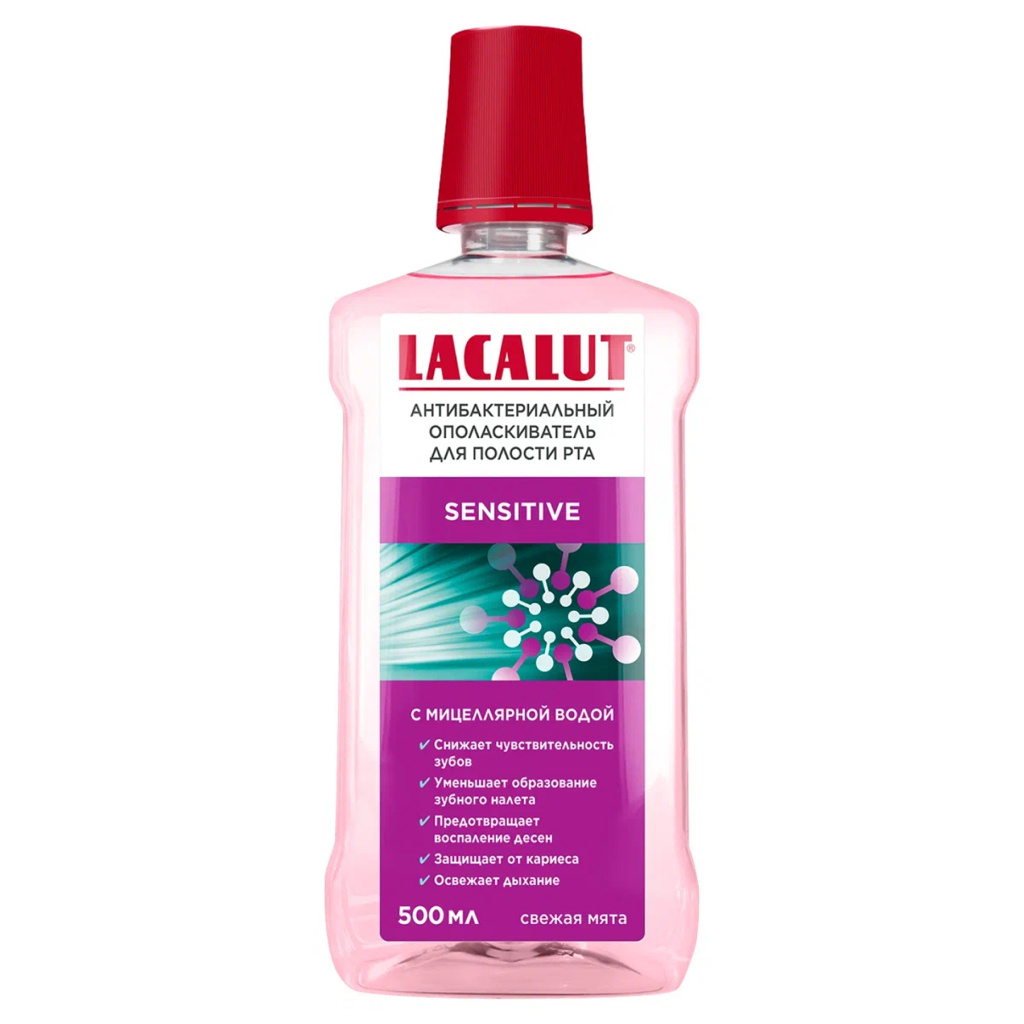 Ополаскиватель для полости рта Lacalut sensitive снижает образование зубного налета и дополнительно очищает поверхность эмали благодаря мицеллам. Хлорид калия уменьшает гиперчувствительность зубов, а фторид укрепляет эмаль и защищает ее от кариеса. Антисептик и лактат алюминия комплексно воздействуют на слизистую оболочку полости рта, препятствуя ее воспалению. Тимол и масло эвкалипта освежают дыхание.