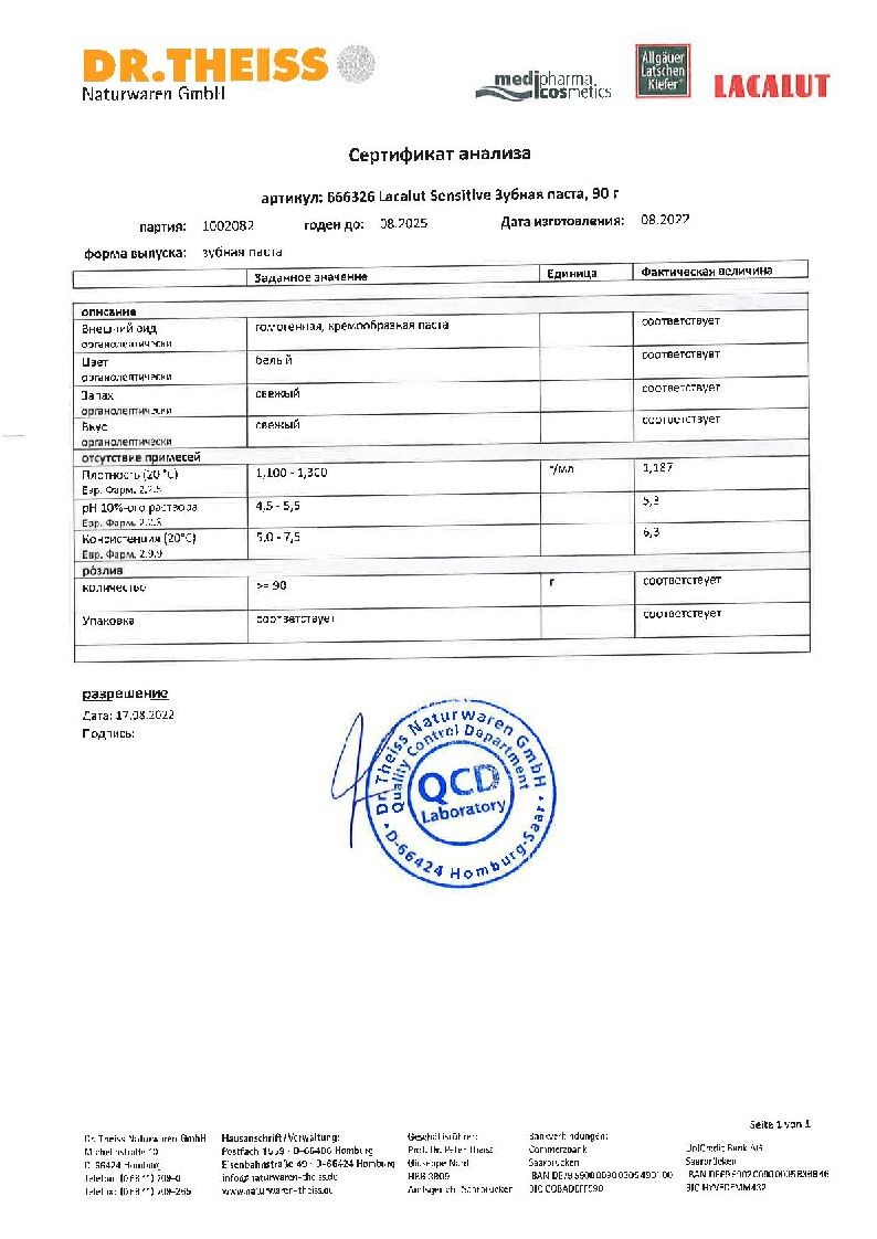 Зубная паста Lacalut sensitive уменьшает повышенную чувствительность к раздражителям (горячее, холодное, кислое, сладкое и другие). Двойная комбинация фторидов способствует реминерализации эмали, снижая болезненную чувствительность зубов и защищая от кариеса. Лактат алюминия укрепляет десны и предотвращает развитие пародонтита, антисептик снижает
