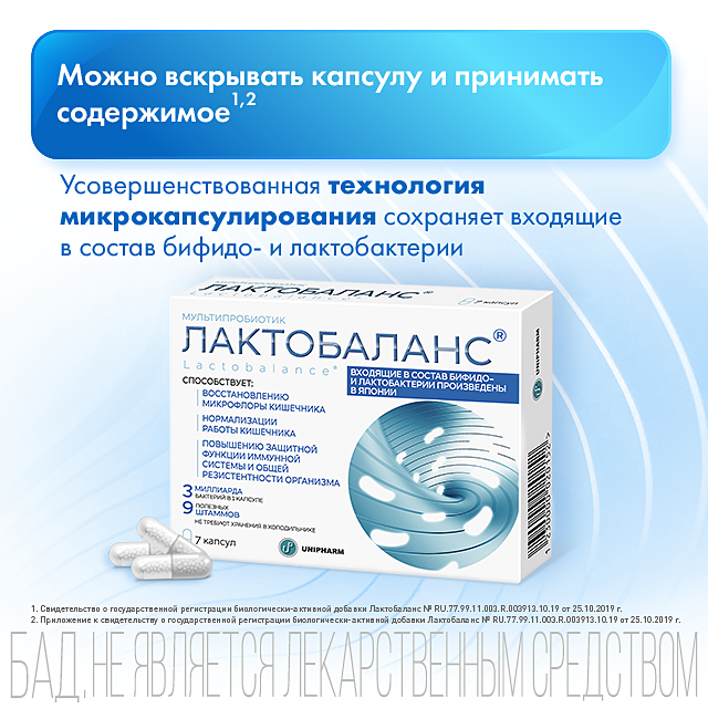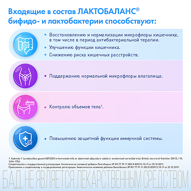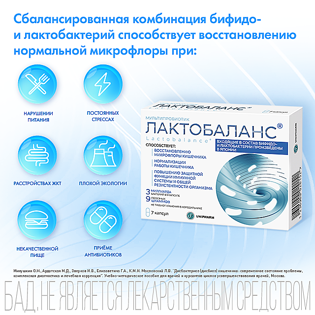 Учитывая полезные свойства бифидо- и лактобактерий, входящих в состав, мультипробиотик Лактобаланс® может использоваться: