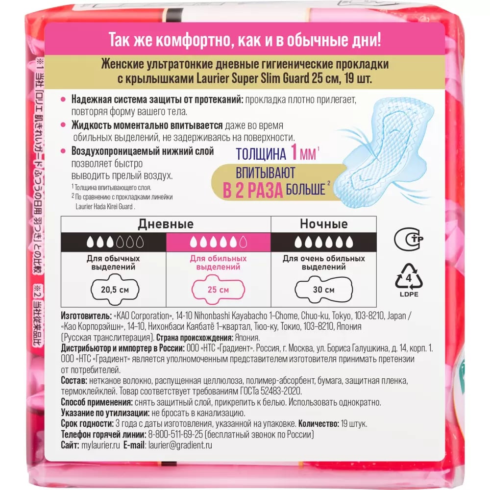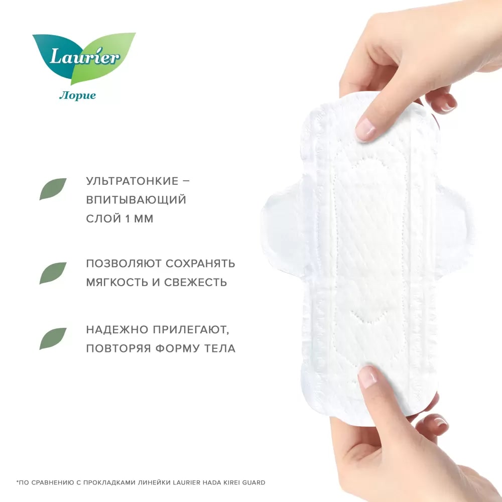Ультратонкие гигиенические прокладки с крылышками Laurier Super Slim Guard предназначены для использования в дневное время суток. Благодаря невероятно тонкому впитывающему слою (всего 1 мм) прокладка практически не ощущается на коже. Прокладки обеспечивают безупречный комфорт, надежно прилегают, повторяя форму тела, и подходят даже тем, у кого чрезвычайно чувствительная кожа. Они хорошо впитывают влагу, не липнут к коже и не натирают ее, обладают высокой воздухопроницаемостью. Ими просто и удобно пользоваться во время критических дней.