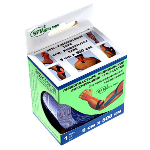 Лейкопластырь кинезио тейп используется для профилактики и лечения травм опорно-двигательного аппарата. Лейкопластырь кинезио тейп SFM 5 см Х 500 см, представляет собой эластичную хлопковую ленту на клейкой гипоаллергенной основе.
