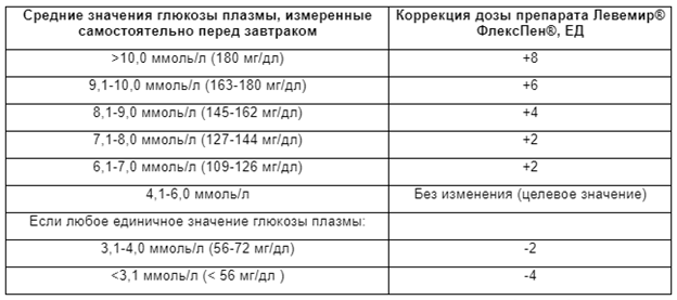Перевод с других препаратов инсулина. Перевод с препаратов инсулина средней продолжительности или длительного действия на препарат Левемир® ФлексПен® может потребовать коррекцию дозы и времени введения (см. «Особые указания»).