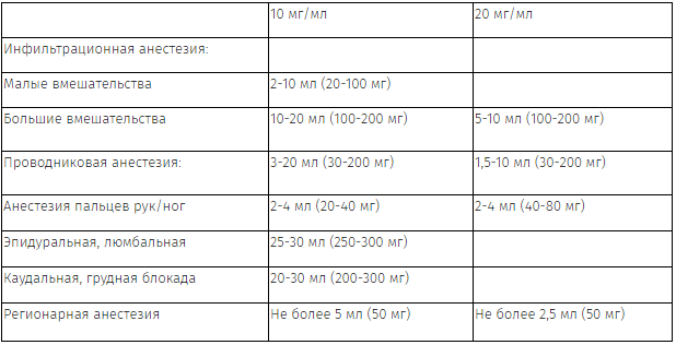 У взрослых и детей 12-18 лет однократная доза лидокаина (за исключением спинальной анестезии) не должна превышать 5 мг/кг, при максимальной дозе 300 мг.