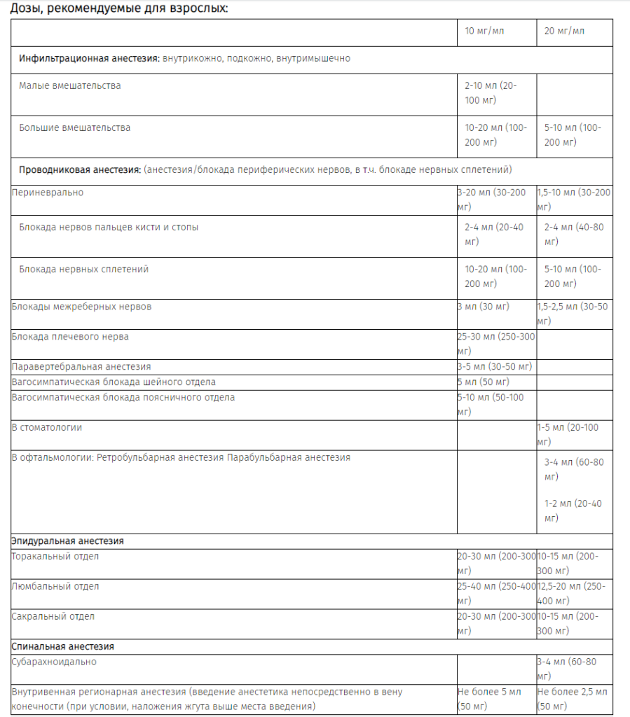 Максимальная доза для взрослых - не более 4,5 мг/кг, рекомендуется не превышать дозу 300 мг; для внутривенной регионарной анестезии не более 4 мг/кг. Повторное введение в течение 24 часов не рекомендуется.